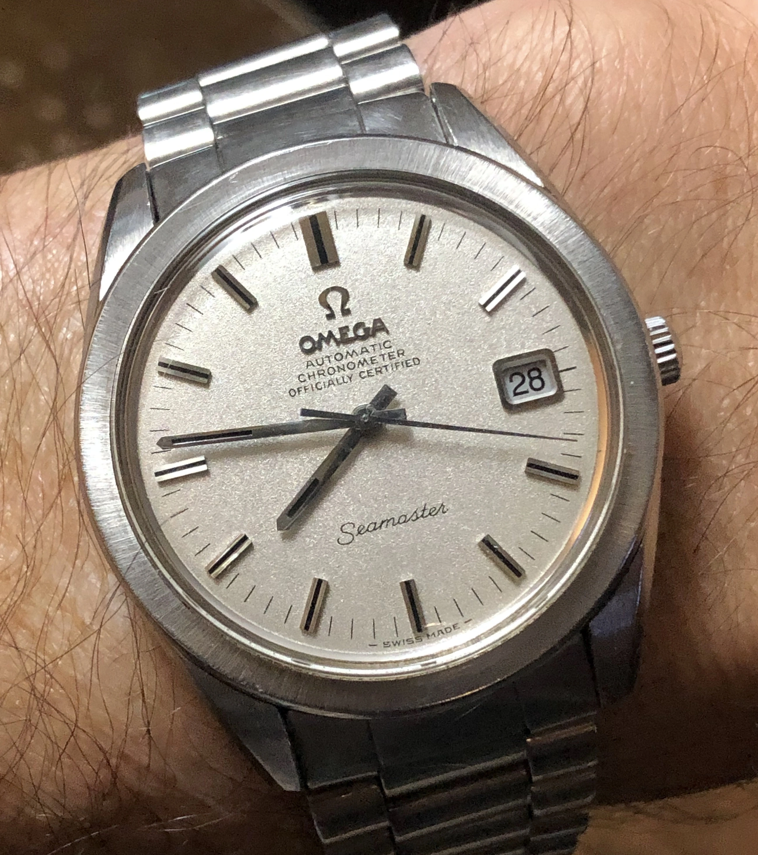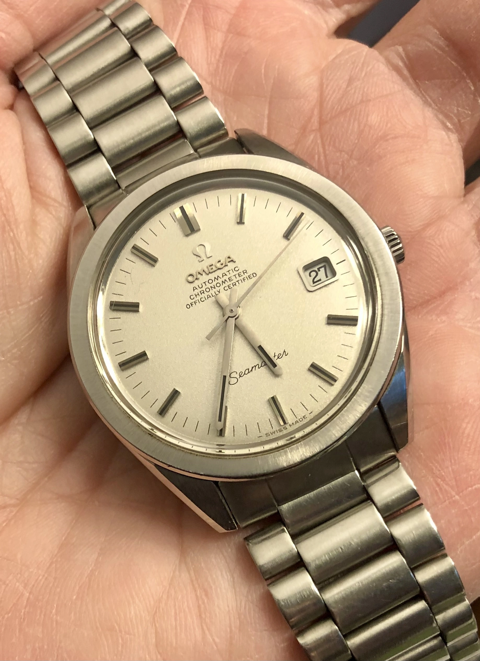 Next up is an Omega Seamaster sparkle-dial chronometer from approximately 1969. Beautiful watch, very clean with a large (36.5mm) sharp case with original finish, and even has the desirable 1125 bracelet with 560 endless. The cal 564 quick-change date works perfectly. Not serviced in my possession. Not much more to say, it's a gorgeous example.