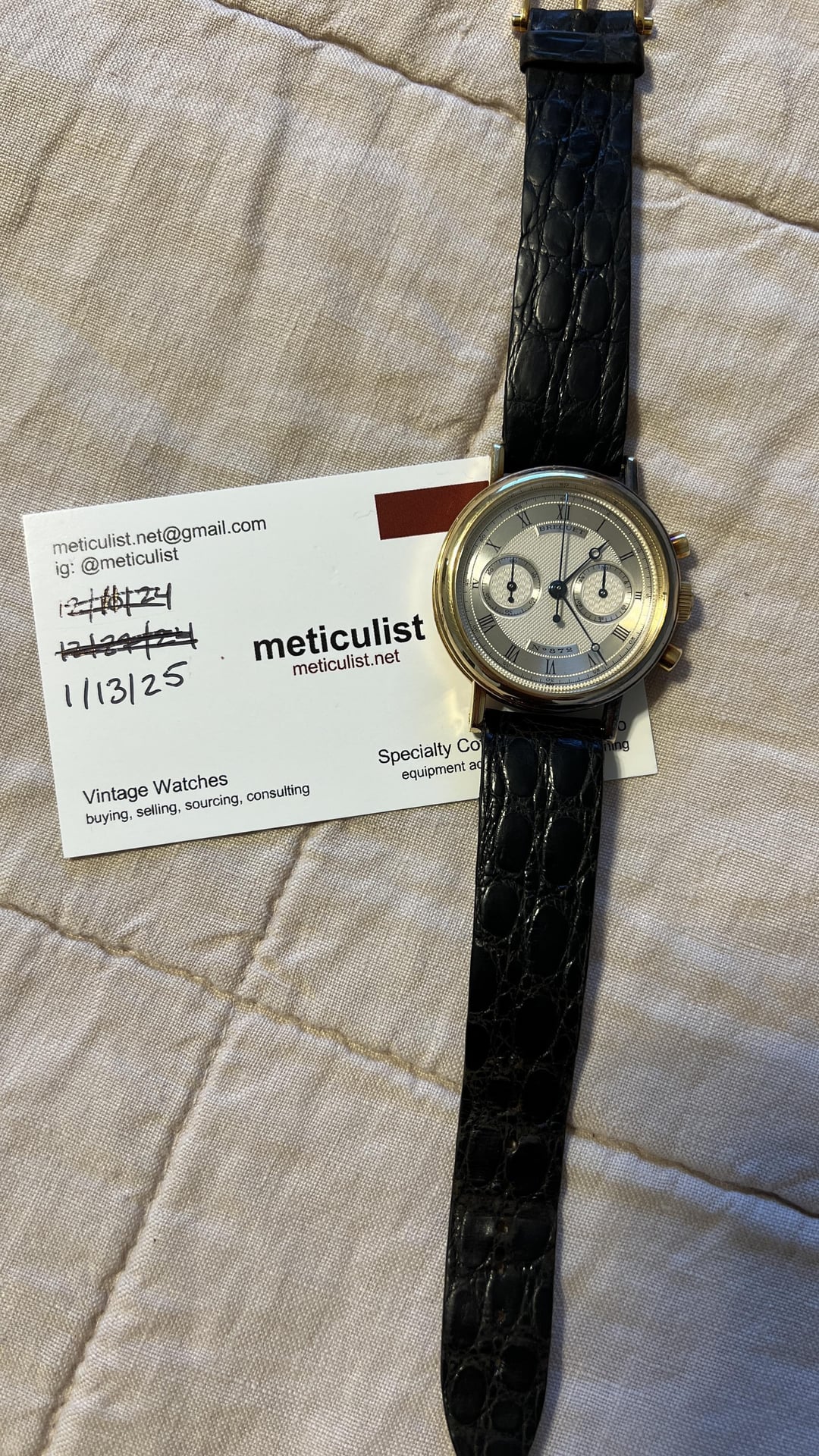 An absolute icon resulting from the Daniel Roth era at the historically important Montres Breguet, the reference 3237 features the beautifully finished Lemania 2310 hand wound movement, signature coin edged mid case and construction, Classique signature guilloche dial, and deeply saturated blued Breguet style hands. This particular early A serial example is made more distinctive and unique due to its heavily patinated case on the crown side, found in several other examples from a similar serial range, providing a charming warmth and character that can’t be imitated. Case: the 36mm solid gold case measures 44mm lug to lug and 10mm thick with 18mm lug width. The case is in overall very nice condition, believed to be unpolished, retaining all original lines and finishing. Light surface swirls are present on the bezel and lugs, consistent with light wear for the age. The crown and pusher side of the case exhibits surface patina or oxidation of a dark blue, purple, oil or gas slick tie dye effect. Dial: the hand guilloche dial features radially brushed metallic hour, minutes, and subregister tracks, the traditional clos de Paris guilloche pattern throughout and a wavy pattern in the subregisters. The dial and hands are clean and free from defect. Movement: the Breguet caliber 533 is a modified Lemania 2310 with cotes de Geneve finishing, a swan’s neck regulator, and Breguet overcoil hairspring. The infamous movement shared with the likes of Patek and Vacheron chronographs is winding very crisp and setting smoothly. The chronograph functions properly with excellent feel and reset. Includes: original signed croc strap and gold buckle with clear and sharp hallmarks. Breguet has confirmed this watch was produced in 1989 and sold to Caldex (Milano, Italy) in March of 1989. Price: $24,500 including insured shipping within in the continental US, international shipping available at cost. Payment by wire or ACH. I have numerous references here, forums, eBay, and instagram (@)meticulist. Thanks mods for the space.