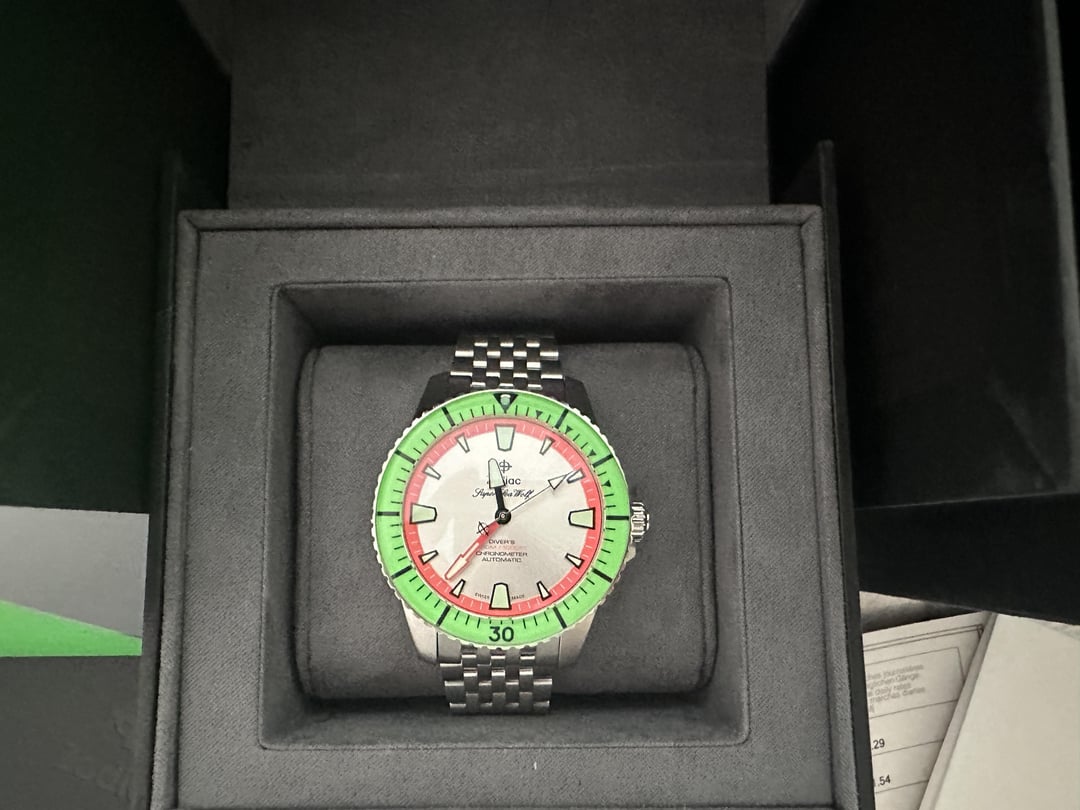 Zodiac Super Sea Wolf Pro-Diver ZO3556 features 300M of water resistance and ISO certification, this Super Sea Wolf Pro-Diver is professionally rated. Complemented by a brushed seven-link stainless steel butterfly-clasp bracelet, sunray dial with Super-LumiNova hands and markers, and fully lumed bezel, the Super Sea Wolf Pro-Diver is COS-C certified and a testament to Zodiac’s technical and utilitarian achievements. Similar to the watermelon colorway except a lot more vibrant and the lumed bezel lasts a long time which is always fun when coming inside. Case size is 42mm Lug width is 20mm Asking $1000 OBO shipped. Zelle, Venmo, PP, wire, & crypto is accepted. Just ask to cover fees if needed. Tag/Timestamp: First pic in album Feel free to reach if you have any questions.