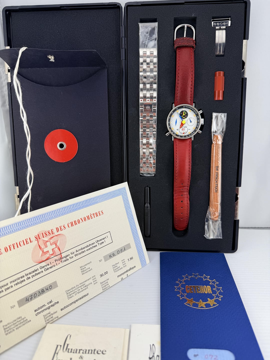 Hey r/Watchexchange! Coming at you with something unique and different today: Alain Silberstein Split Second Chrono. This is one of only 100 ever made, and it comes with all of the original paperwork and accessories. 📍**Functions:** - Power Reserve - Split Seconds Chrono - Date - Time ————————————— .Additionally, this one features a stunning open caseback and is marked 72/100! 💰**$6,250.**