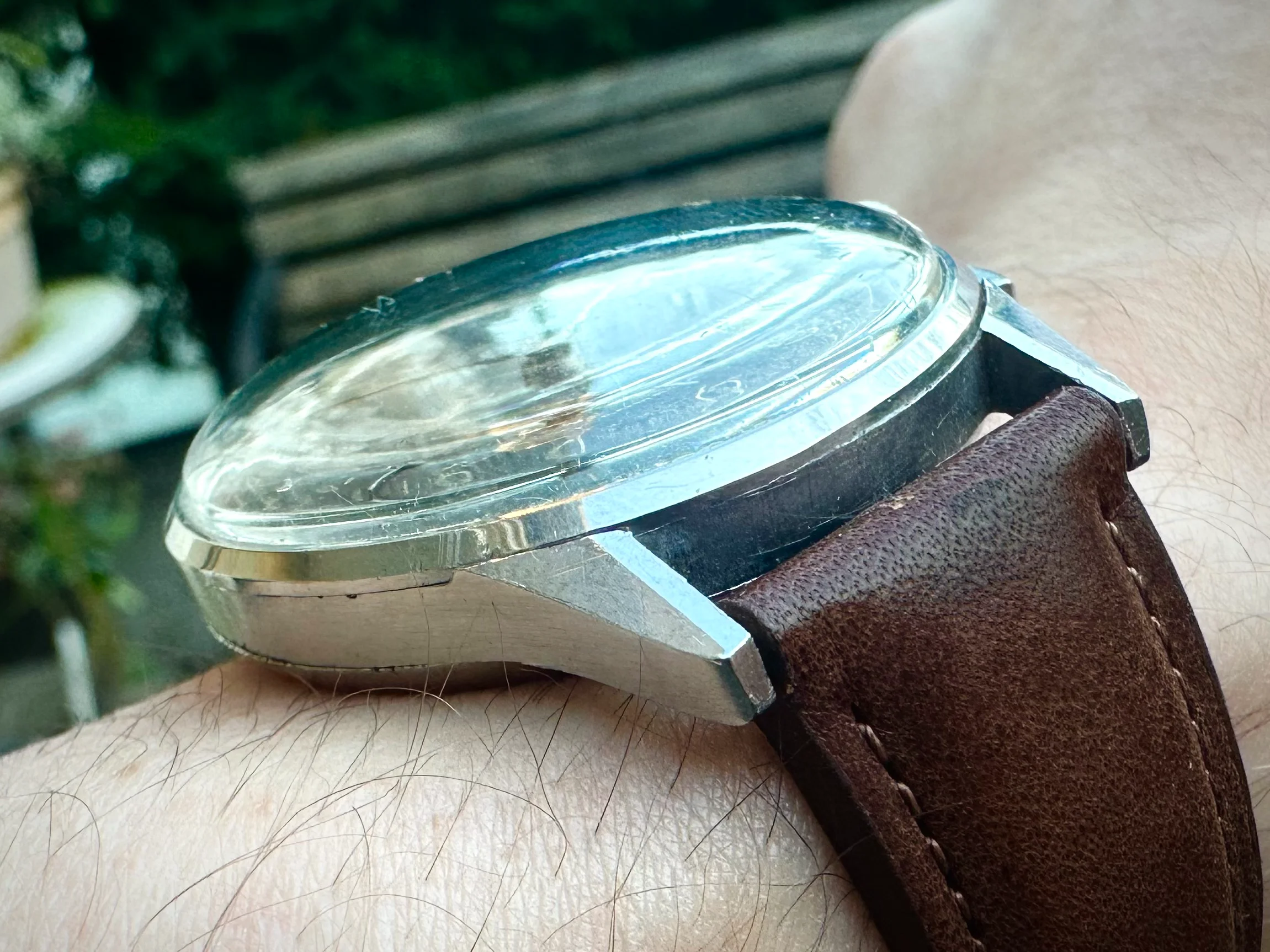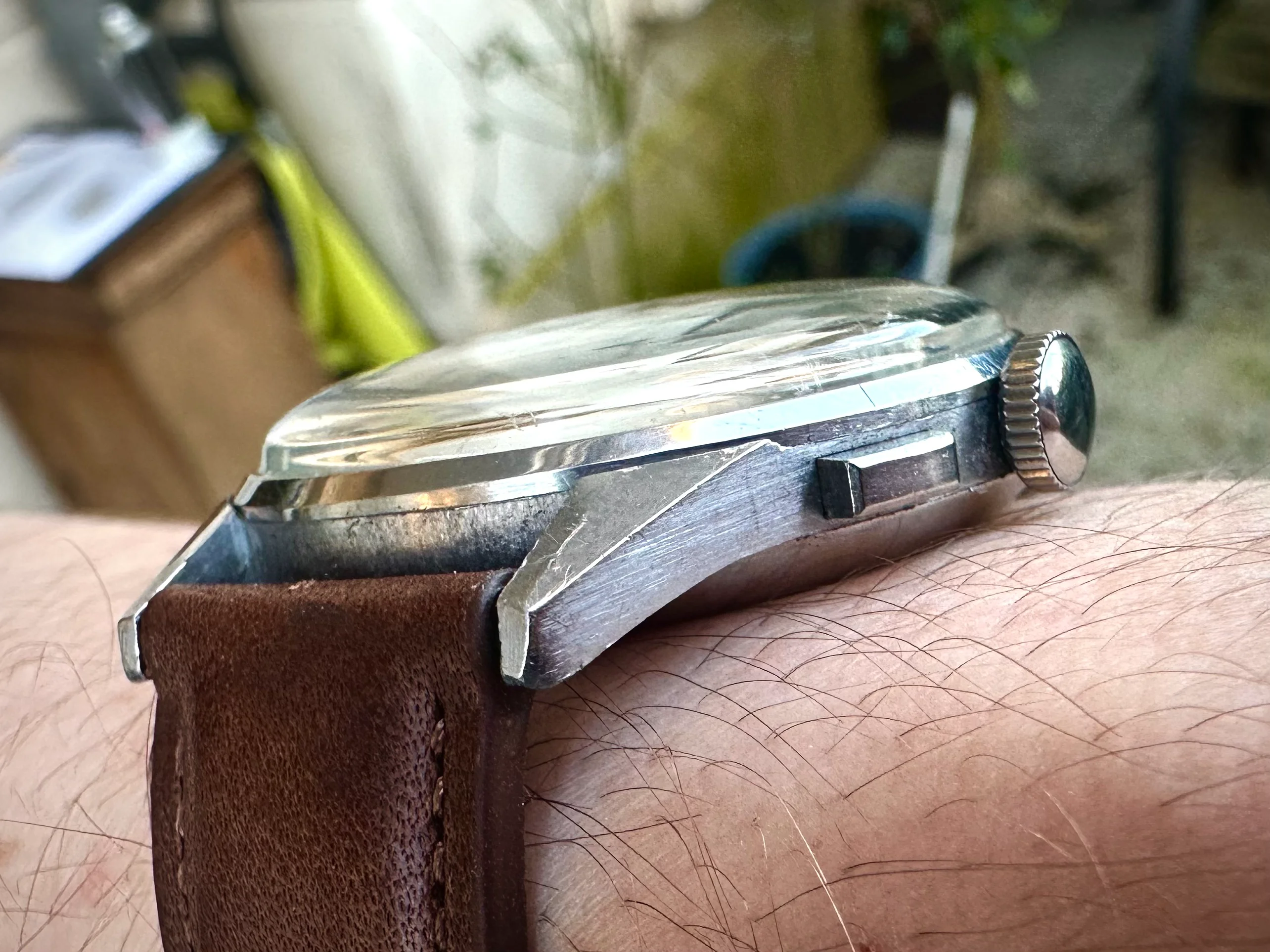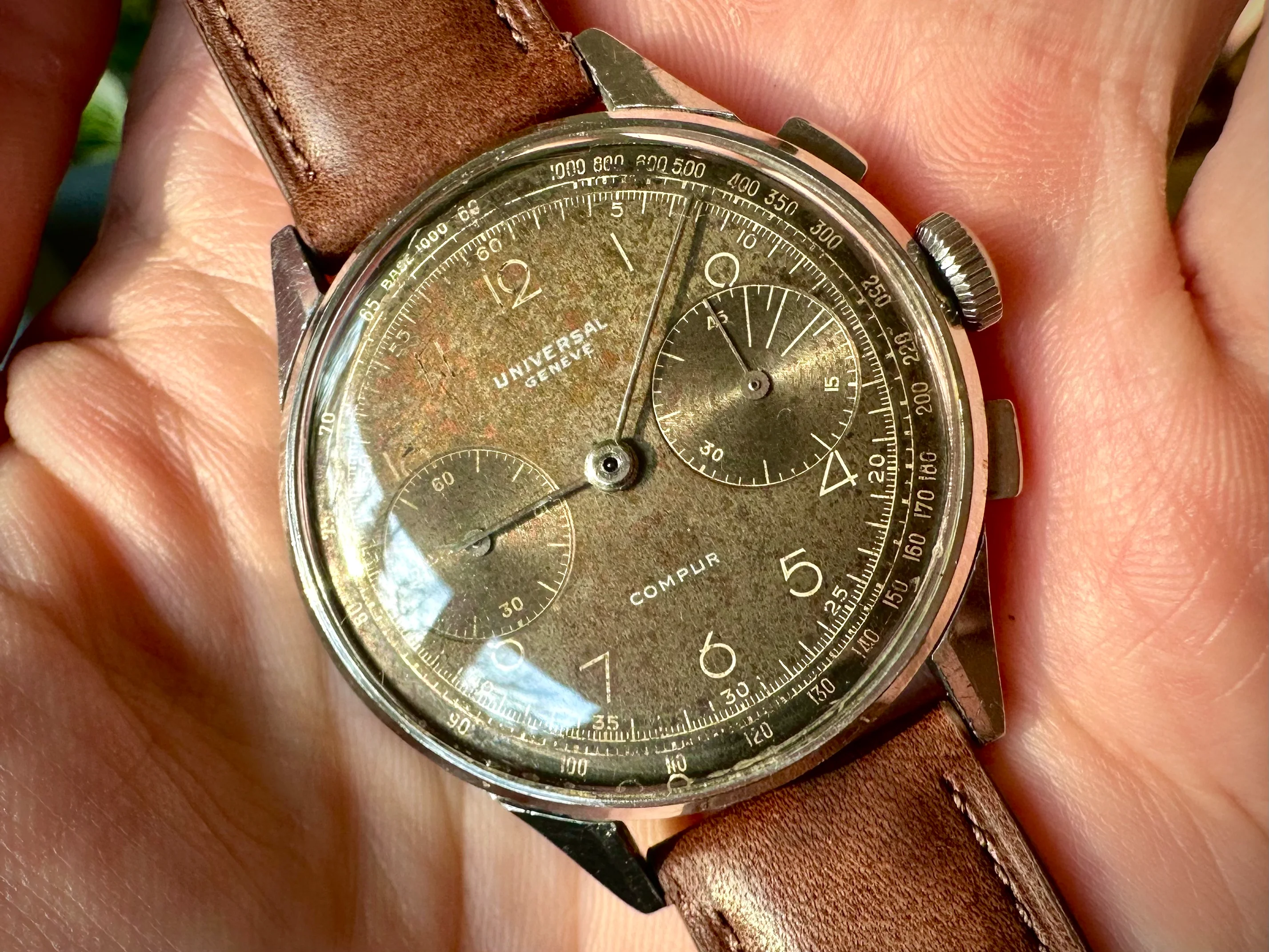 The dial has developed a beautiful patina over time, shifting between brown and copper tones depending on the light, giving it a unique look.