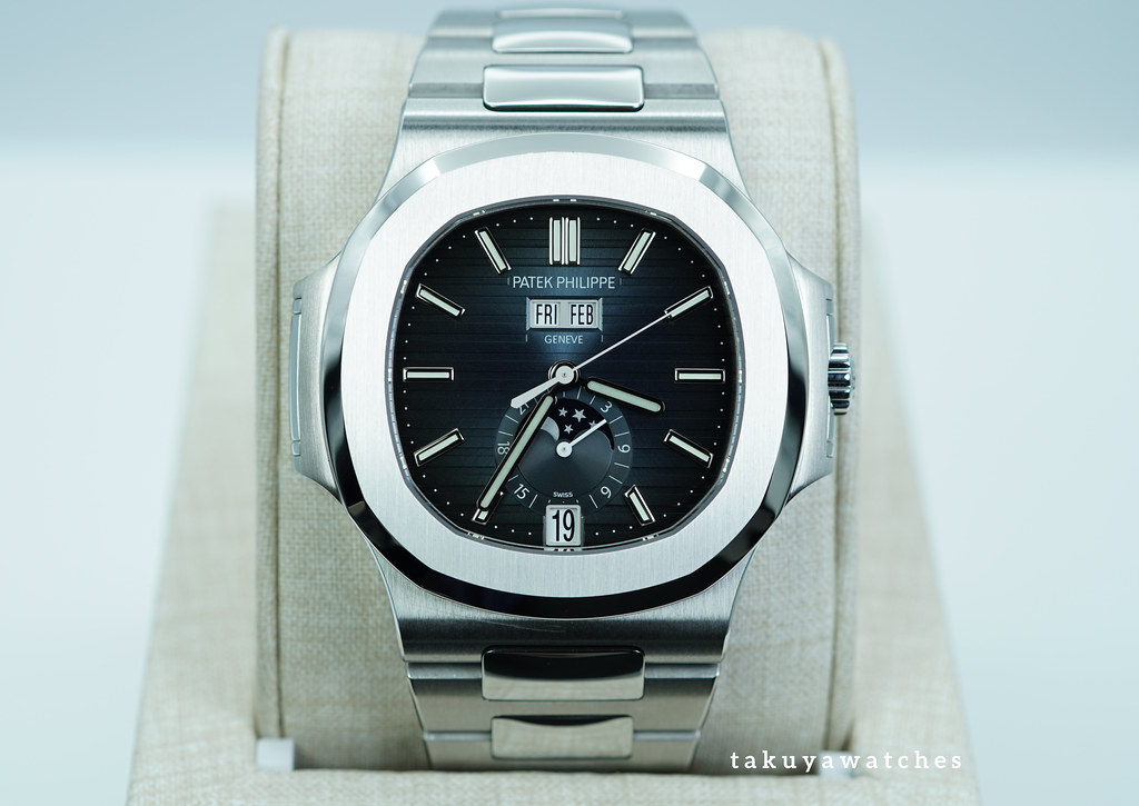 Hi, Selling A Like New, Unpolished Condition & Very Beautiful 2021 40.5mm Patek Philippe 5726/1A Stainless Steel Nautilus Annual Calendar Moonphase with Blue Dial. Purchased from Patek Philippe USA Authorized Dealer in 2021. It has Old Style Small Patek Logo Clasp. Watch Running Perfect with Non Issues. Full Links & Full Set.