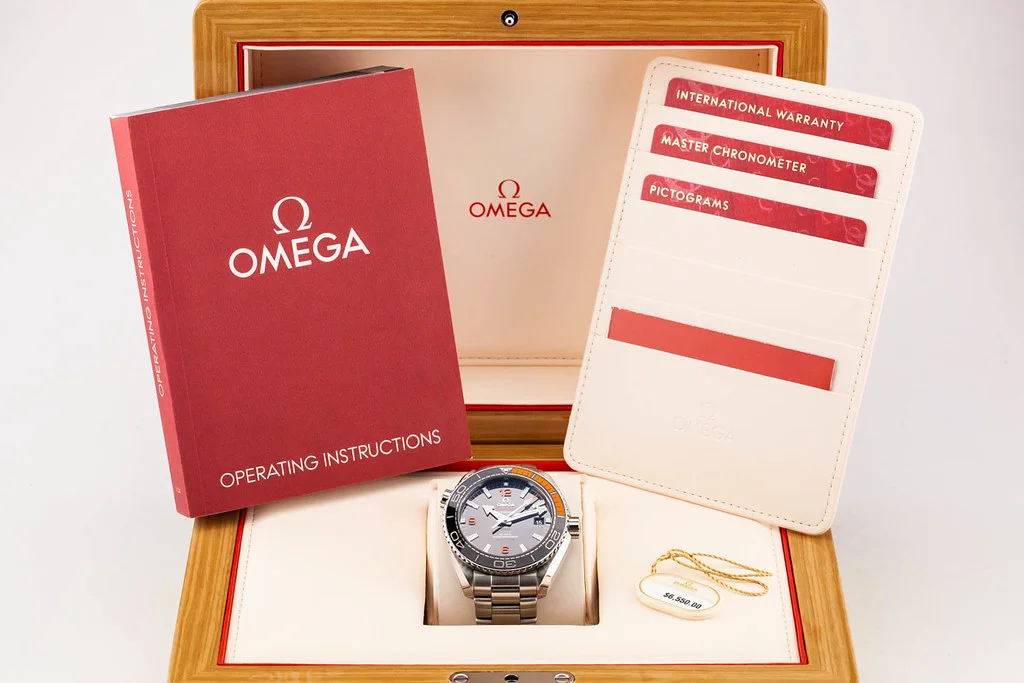 Up for sale is a brand new Omega Planet Ocean 8900 43.5mm Black with Orange accents, reference # 215.30.44.21.01.002 It comes complete with all boxes, papers, booklets, hang tag and Omega Warranty Card dated February 2025.