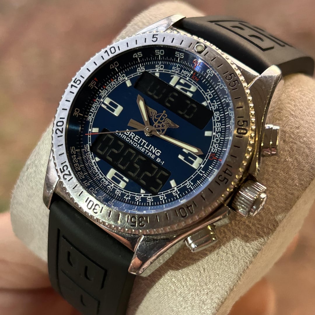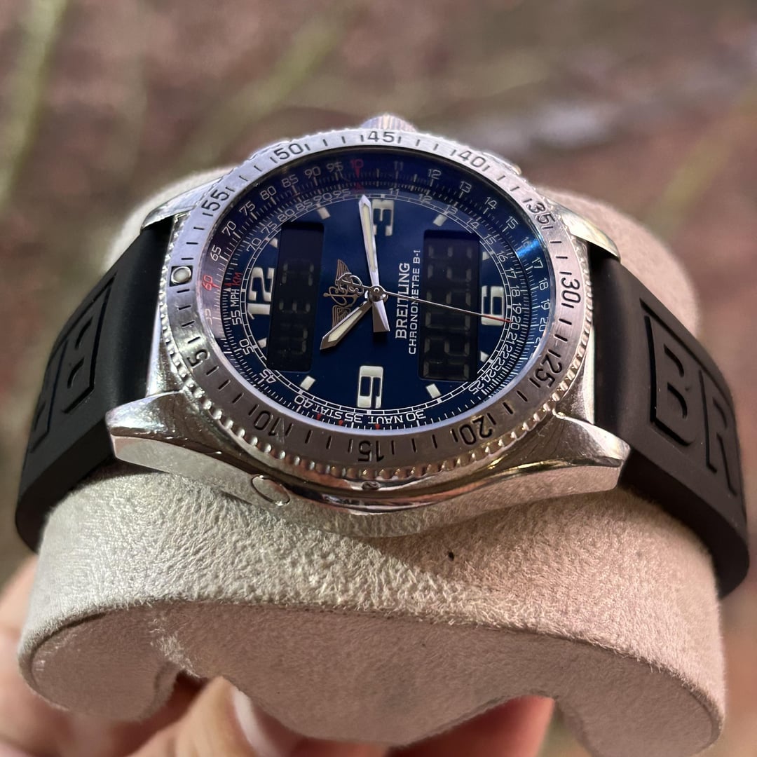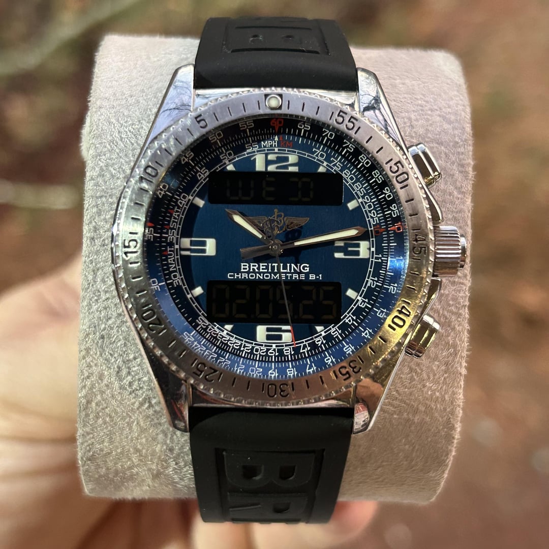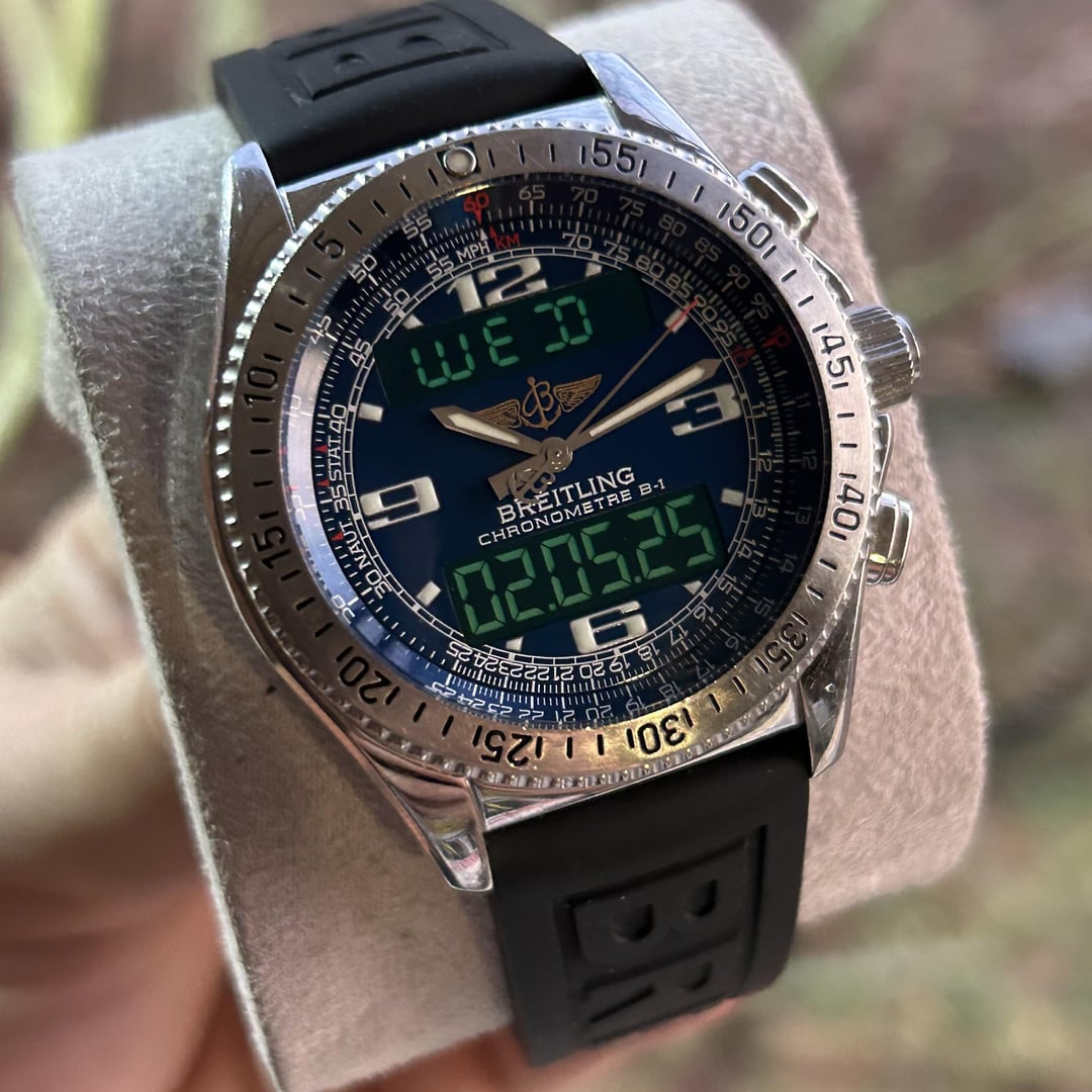 Breitling B1 Blue Info: 43mm case. Breitling 68 movement. Perpetual Calender. Alarm function. Dual TimeZone function. Analog + digital display. Included: Watch, Booklet and warranty papers. Condition: Preowned good condition. Seems to have been recently polished. Minor hairline marks can be seen close up. Watch functions correctly. Comes on rubber Breitling strap. Price: 💲1️⃣6️⃣9️⃣9️⃣ Delivered (In USA) Payment: Bankwire or Zelle. Plentiful reviews and references under the business name ‘Nicknack Timepieces’ Tagged photo: https://i.imgur.com/lvLQlps.jpeg