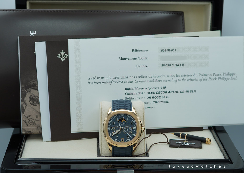 Hi, Selling A New In Box & Very Beautiful 39.9mm Patek Philippe 5261R 18K Rose Gold Aquanaut Annual Calendar with Blue Dial. Its on Blue Tropical Rubber Straps with Patek Philippe Rose Gold Fold-Over Clasp. Purchased from Patek Philippe USA Authorized Dealer in 11.2023. Unworn with Sticker still on the clasp. The Strap Cut to 6.5 Inches Wrist. Full Set.