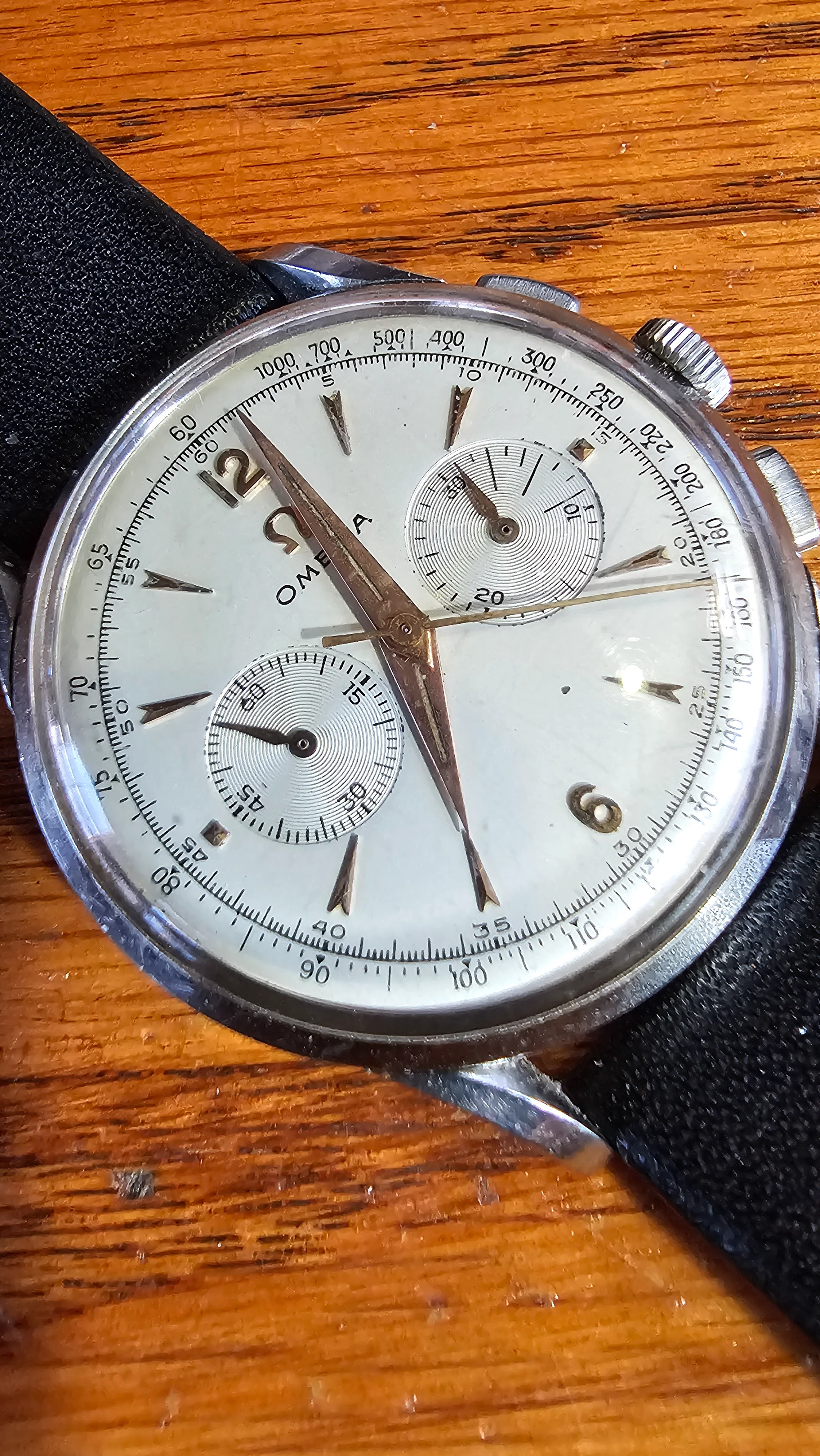 For sale today is an old Omega chronograph reference 2475 37.5mm in diameter powered by a 320.