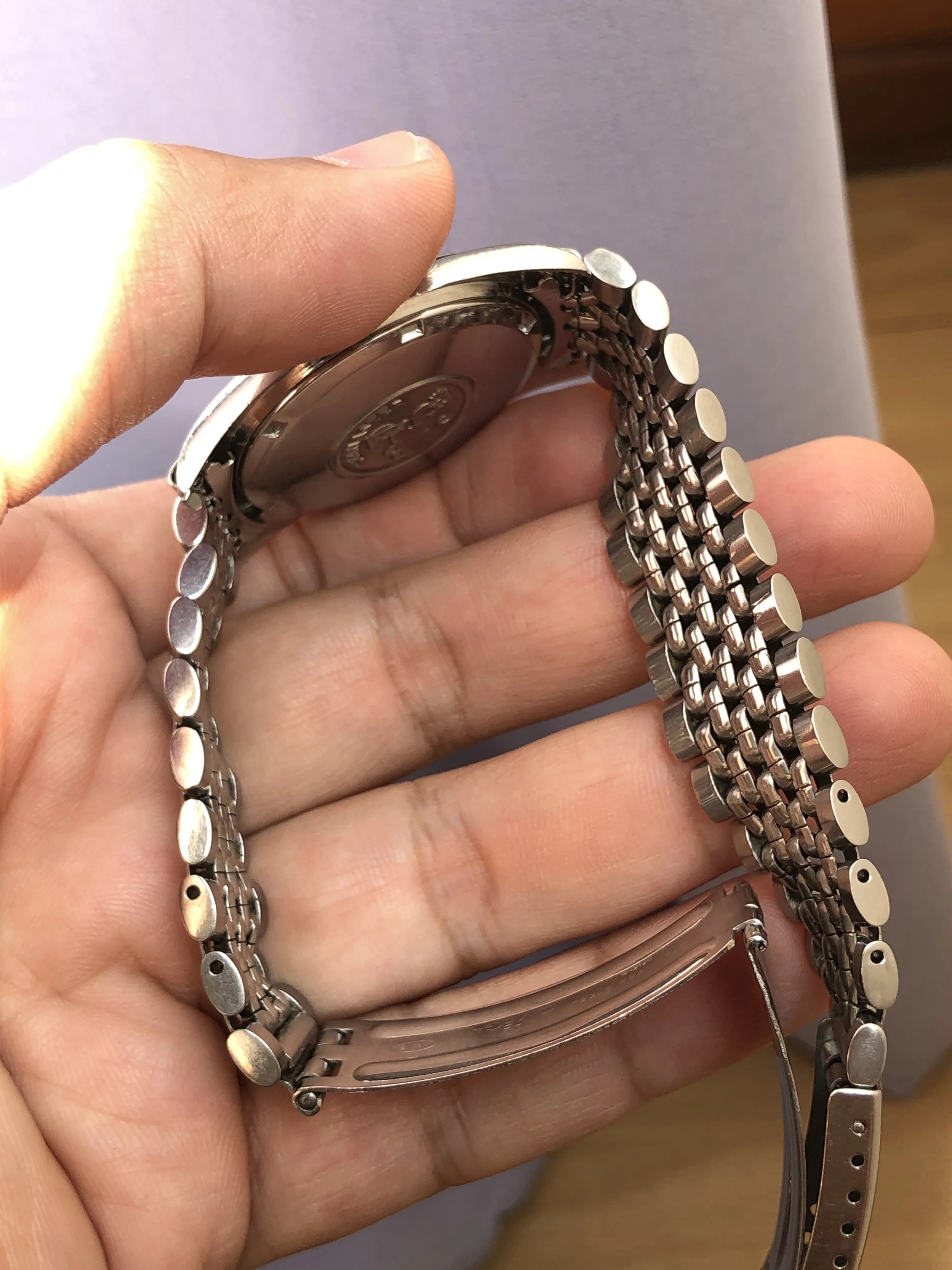 • Bracelet: Long original Omega bracelet reference 1036 with 511 end-links (22 links, 3 removable). All links are in very good condition; triple fold clasp featuring micro-adjust with Omega logo. The original riveted bar at centre of clasp was replaced as shown in photos below.