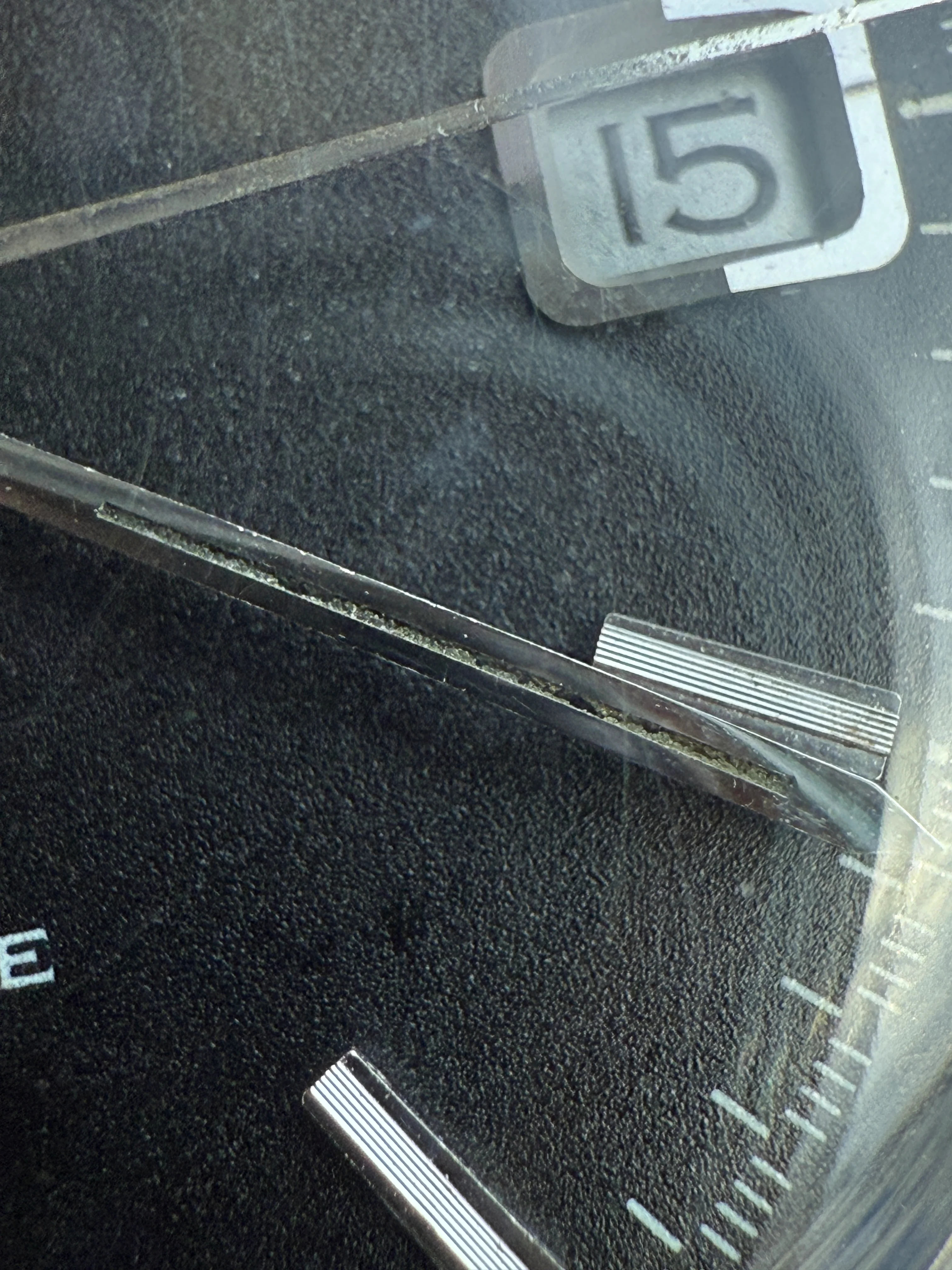 - Dial: Original balck racing dial in good condition. A tiny rounded scratch between 46 and 47 (as shown in photos below). Solid grooved hour markers with lume; baton hands with lume; all lumes on hands and hour markers are rotten or lost but you can hardly see anything strange on this black dial; faceted date-aperture frame; prints, hands, hour markers are all good.