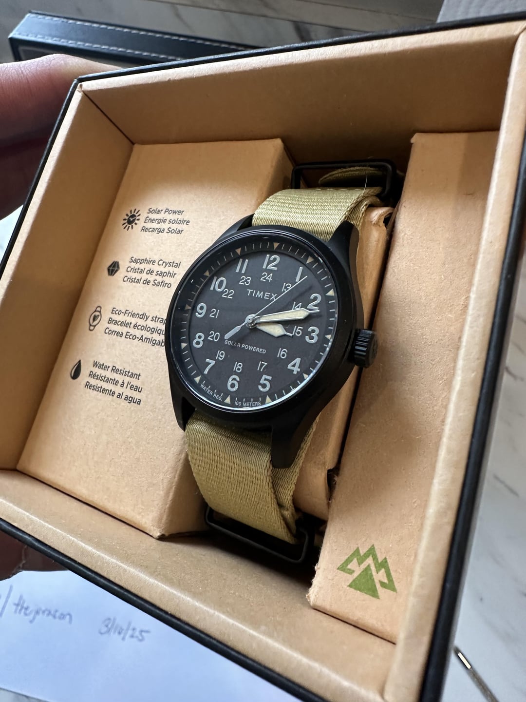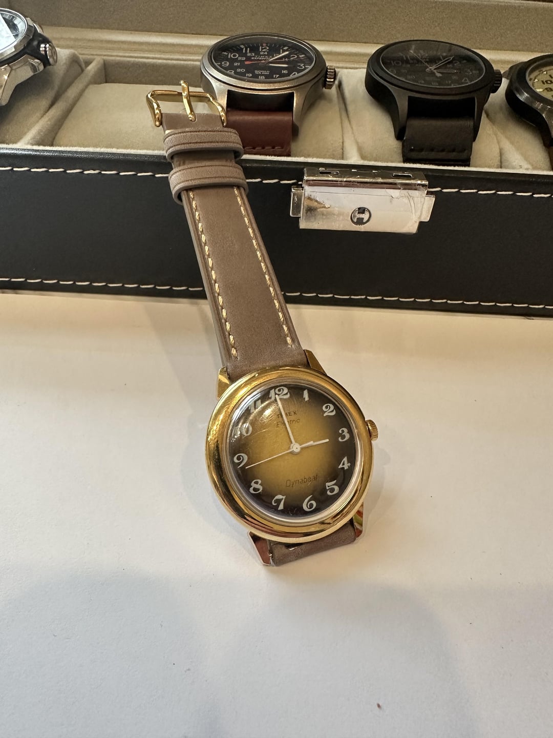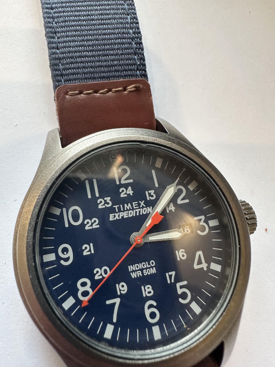 Prices are shipped in CONUS paid via PayPal, buy pays fee if you’d like to use GS. 1- Citizen AW1150 Weekender Eco drive 44.5 mm and lightly used but great condition. $150 2- Vintage Nike Professional 1500 women’s watch. 28mm original strap, new battery $40 3- 1970s Timex Electric Dynabeat 37mm new battery, great vintage condition…crystal has surface scuffing , brand new leather strap $50 4- Timex Expedition Scout 40mm blue face, original strap, tiny chip on edge of crystal, indiglo works $30 5- Timex Expedition Scout 40mm Black. New never worn. Indiglo works. Original strap $50 6- Timex Expedition WR50 wave dial, 38-40mm with crown guard, original strap. Great used condition, indiglo works $30 7- Timex Expedition Acadia Rugged 42mm NOS never worn, replacement NATO strap, indiglo works $45 8- Timex Field Post Solar 36mm BNIB never worn. $125