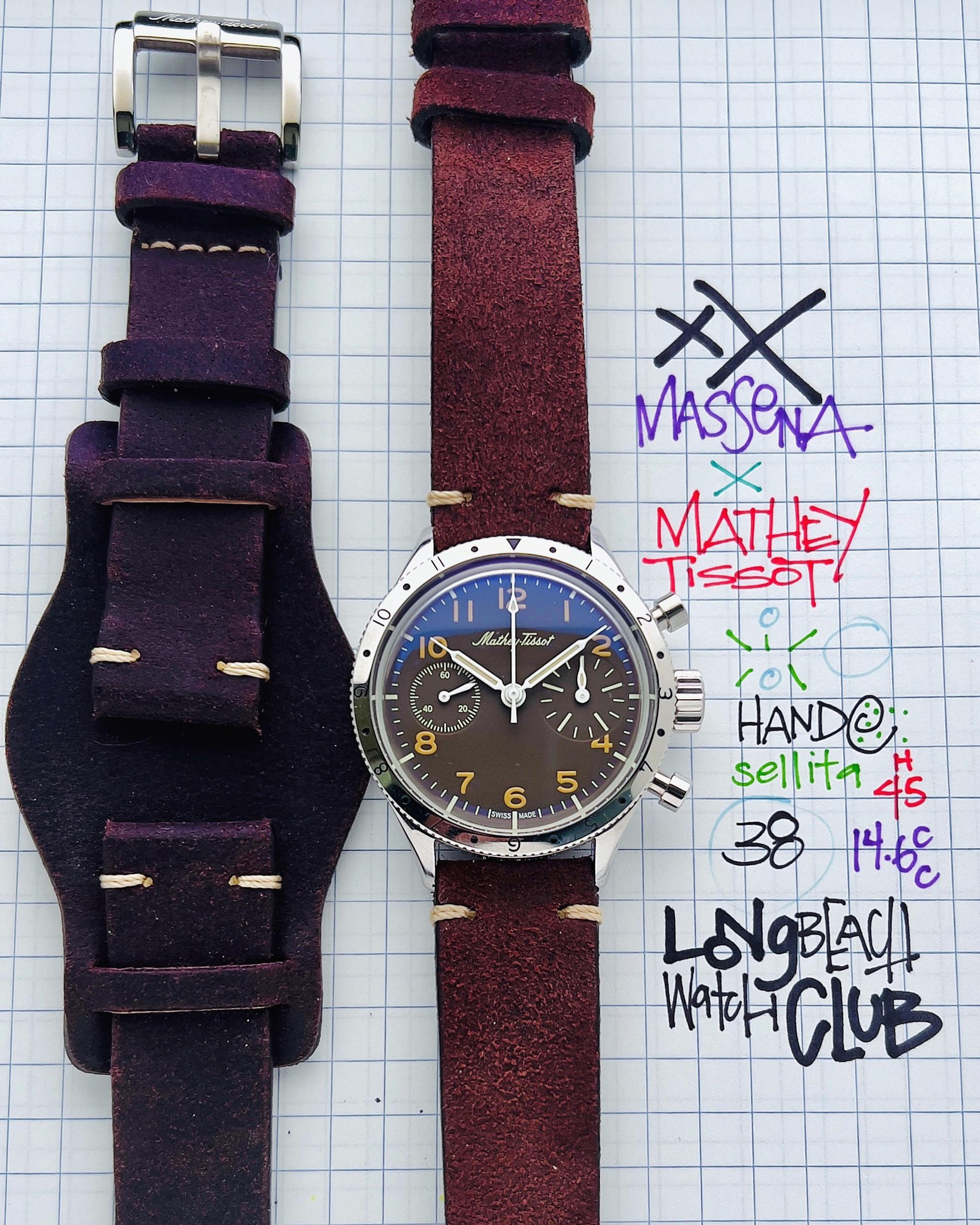 Mathey-Tissot x Massena LAB Type XX Tribute Chronograph This piece is a collabrotation between Swiss watchmaker Mathey-Tissot and the horology lab Massena. Reimagined through a modern lens, the Tribute Chronograph has a warm, brown, tropical dial, and coffee-colored, luminous Arabic numerals and based on William Massena’s personal vintage Breguet Type XX chronograph. This reference was limited to 99 pieces and sold out at the $1995 price point. Kit, pics and video: https://imgur.com/a/ud0ZhQF Timestamp: https://imgur.com/a/YMPhA4x • manual-winding Sellita caliber SW510BHa • 38.5mm X 14.6cc X 45.5 lug to lug. • Bi-directional, no click bezel & Oversized crown. • Box mineral glass with anti-reflective, sapphire coating. * local special: can possibly accommodate at ButterScotch in Downtown Long Beach by appointment * All sales final unless the watch is misrepresented or lost in transit (always fully insured) * Link to [feedback here](https://www.reddit.com/r/WatchExchangeFeedback/search?q=soycowboy&restrict_sr=1&sort=new) & [watchcharts here](https://watchcharts.com/repcheck/user/soycowboy?source=reddit&type=feedback) * Asking a *negotiable* **$1480** via bank wire, Zelle, venmo, or possibly PayPal Friends & Family with super strong references or if I know you. Price includes fully insured Fedex shipping in the USA— hand delivery in most of the Los Angeles or Orange County areas with drinks or coffee on me ;). Cheers, Stephen