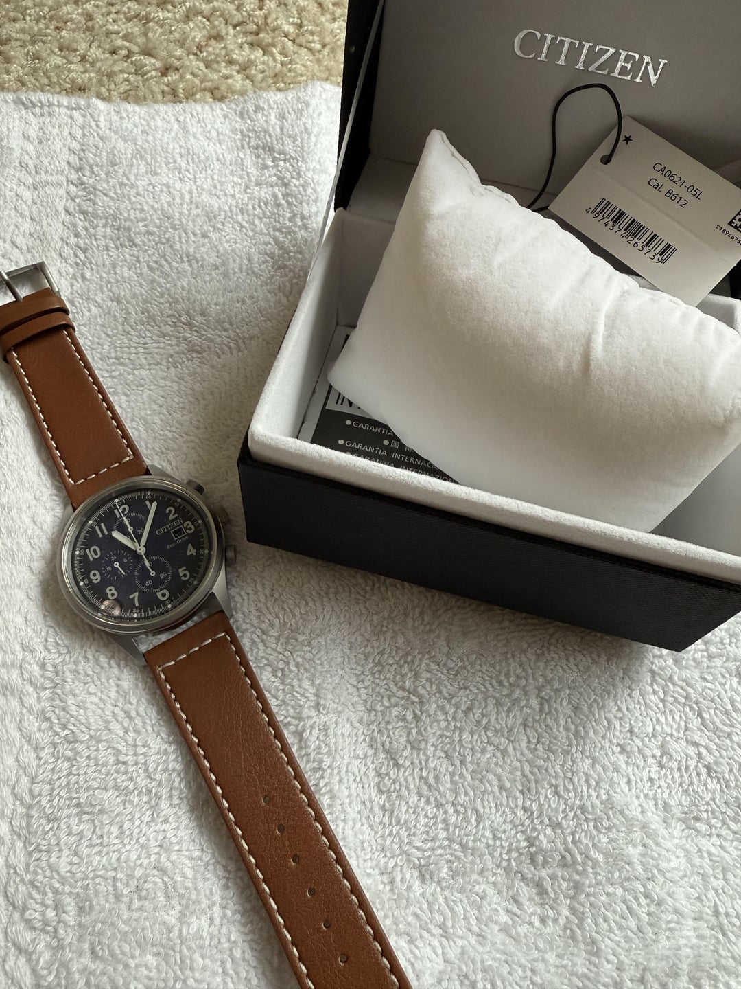 Selling a citizen Chandler chronograph. It’s Eco drive and has only been worn three times on a different strap. Comes with box and pillow This is my first watch exchange posting so please bear with me Model: CA0621-05L Case Size: 42mm Thickness: 12.5mm Material: Stainless Steel Movement: Citizen Caliber Eco-Drive B612 Solar Band width: 22mm Water Resistance: 100m/330ft Lens: Mineral Crystal Purchased from JomaShop in February 2025 Works perfectly, just too big for me CONUS Shipping included in price. PayPal, ApplePay accepted Can provide more pics if requested