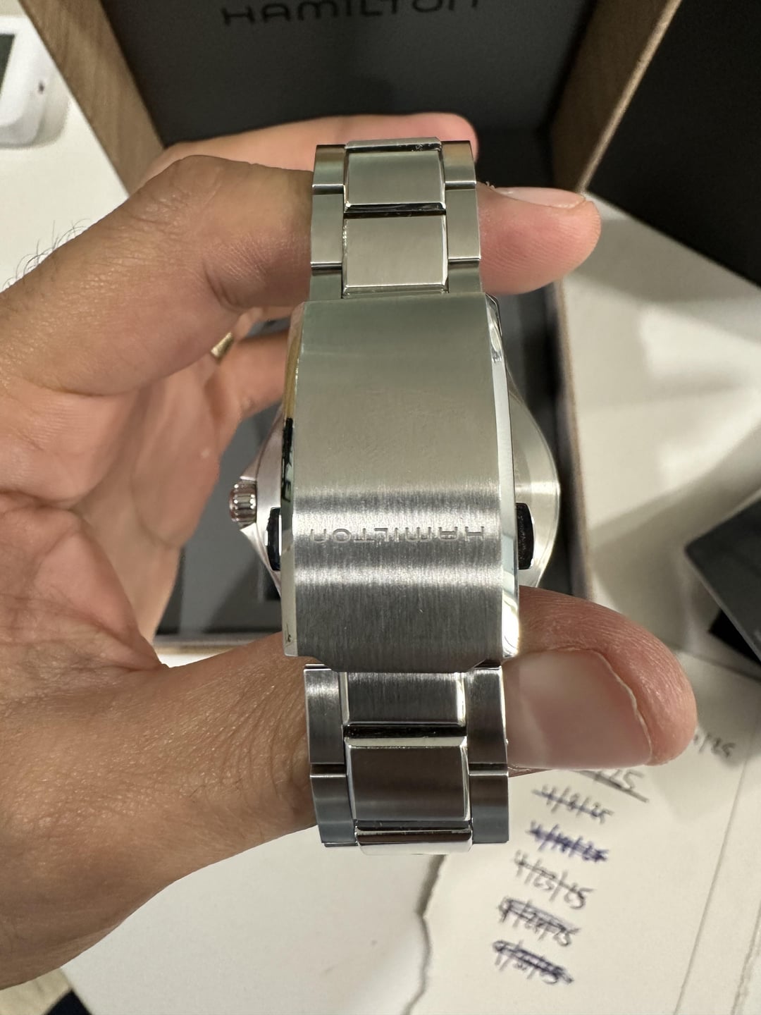 Up for sale is my Hamilton Pilot day date automatic. It’s a beautiful watch but unfortunately not getting enough wrist time. Bought new from AD in 1/2025. This is a full kit. In like new condition, the bracelet was resized to my 6.5 inch wrist but extra links are included. I’ve only worn this watch once or twice. Price: $750; includes UPS shipping to CONUS Happy to answer any questions