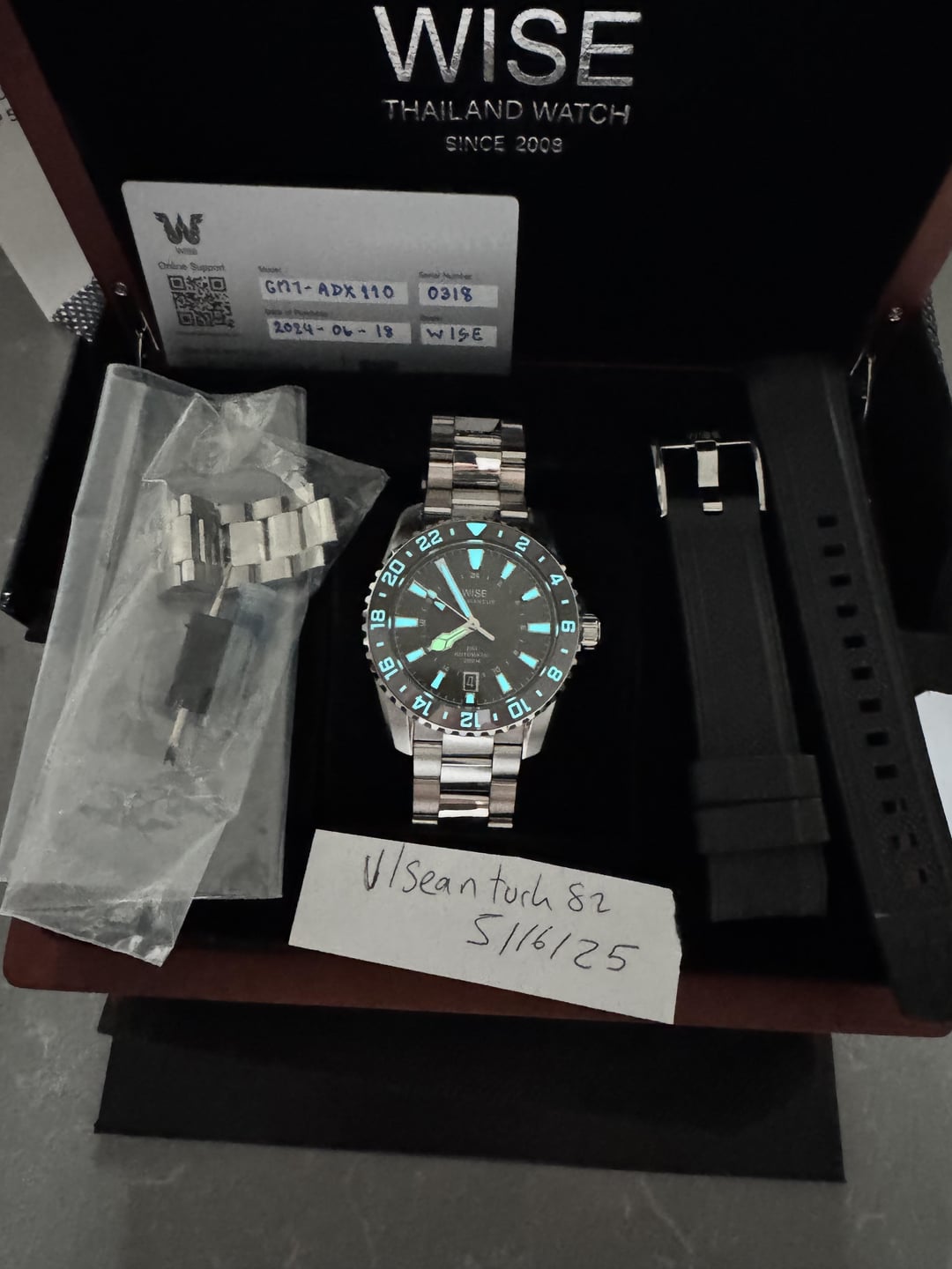Good morning Watchex, Any Wise fans out there? I am a huge fan of these watches and I think they’re one of the best coming out of Asia with top notch quality. The lume,the fit and finish as well as the quality is really unmatched compared to anything else. Price : $635 shipped Includes: I am including full kit with bracelet and all links plus and fkm rubber wise strap (look at timestamp). Please feel free to reach out if you would like to see more photos with the rubber, but an integrated rubber strap from wise is included. Warranty activated 2024. Wise offers 12 months warranty only. Condition: 9/10 id say. Just a slight blemish on lower right lug (see pic 4) and some clasp rash. The white works like it should and it keeps great time. Bezel, and glass spottless Location: Plano, TX Payment: Venmo, Zelle, PP FF Feel free to reach out to me if you have any additional questions or concerns.