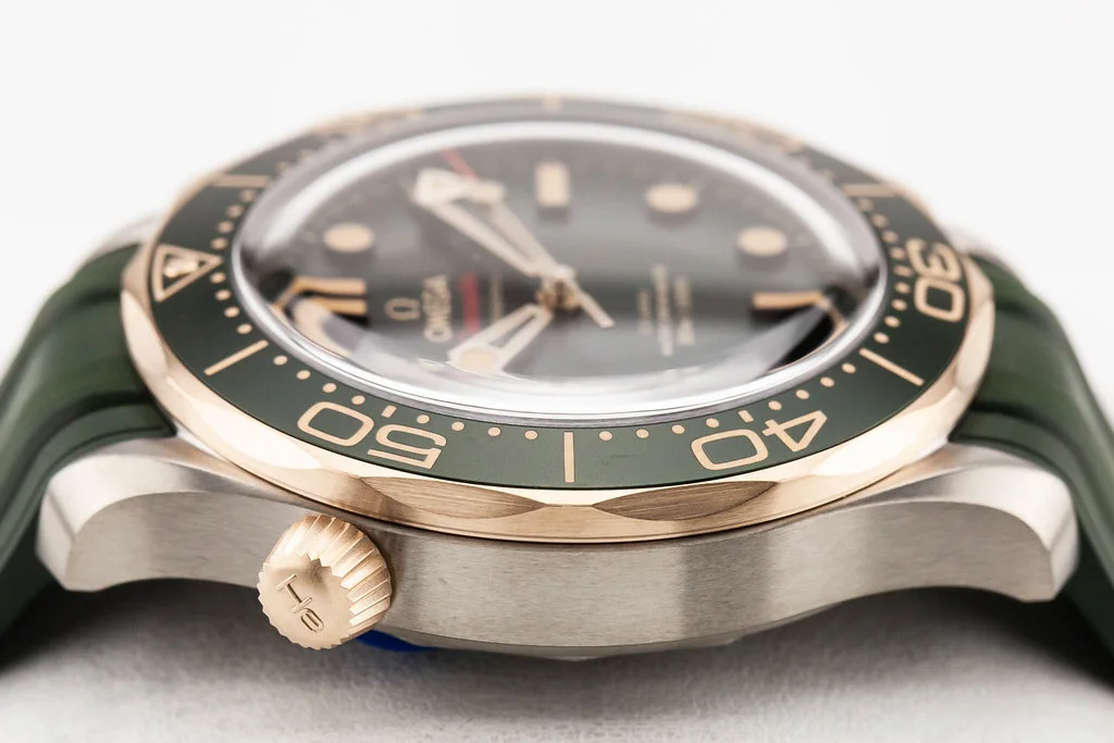 Up for sale is a brand new Omega Seamaster 300M 42mm Titanium / Bronze Gold Bezel Green Dial on Rubber Strap, reference # 210.92.42.20.10.001. It comes complete with all boxes, papers, booklets, hang tag and Omega Warranty Card dated May 2025.