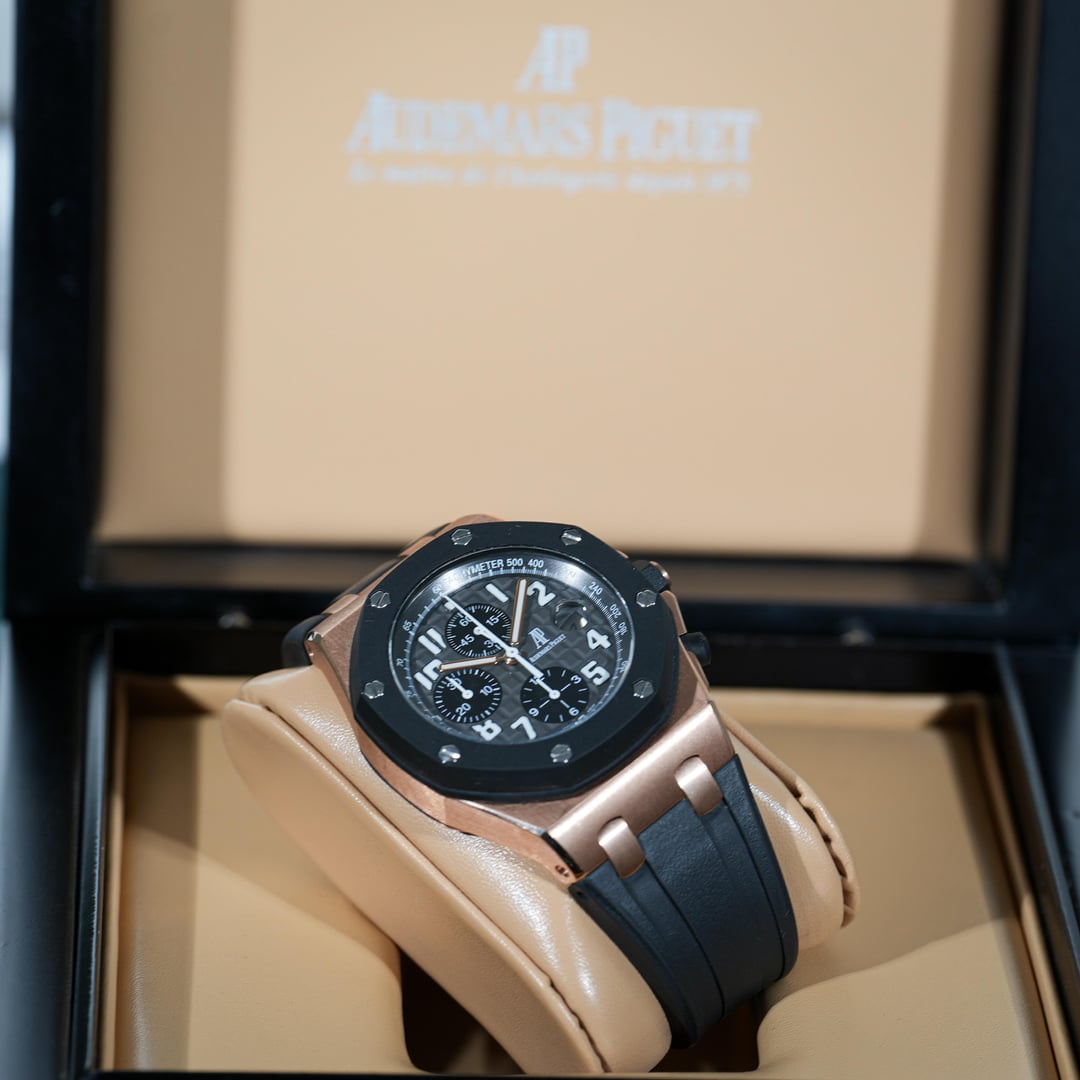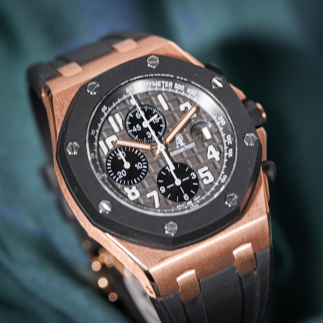 Timestamp https://imgur.com/a/UFWQHzL Up for sale is the iconic Audemars Piguet Royal Oak Offshore Chronograph, reference 259400K.00.D002CA.01.A, also known as the "Rubber Clad." Crafted in 18K rose gold with a bold black rubber bezel and strap, this 42mm timepiece strikes the perfect balance between sport and sophistication. The anthracite grey dial features black subdials, applied Arabic numerals, and a date window at 3 o'clock, all protected by a scratch-resistant sapphire crystal. Powered by the self-winding AP Caliber 2326/2840, it delivers precision performance with a 40-hour power reserve and 100m water resistance. This reference is discontinued and highly sought-after, making it a standout piece in any serious collection. This particular example is in flawless condition, showing virtually no signs of wear. The case, bezel, and strap are immaculate, and the movement runs with exceptional accuracy as tested by our timegrapher Comes with watch and box as pictured. $24,500 shipped to FedEx location for pick up fully insured.