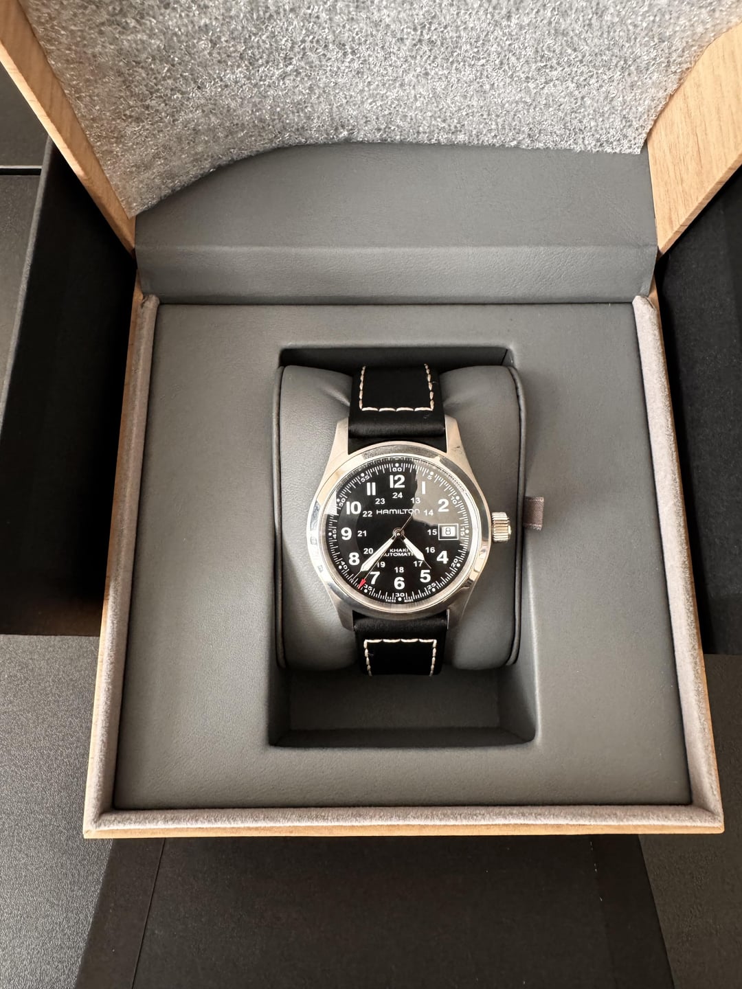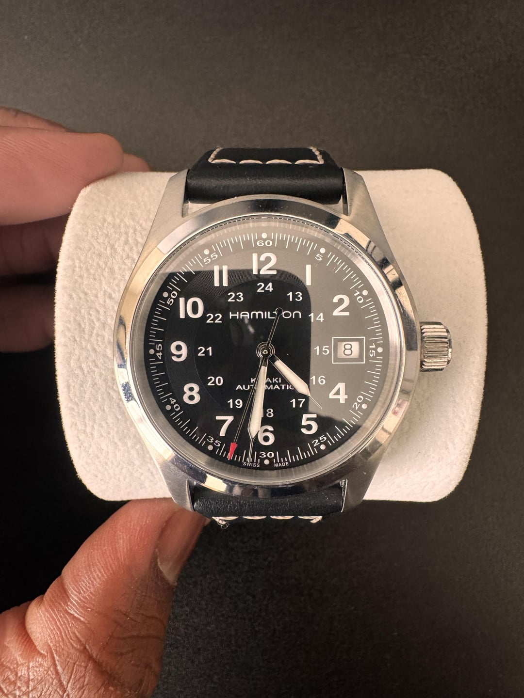 Hi all, I’m looking to sell my Hamilton Khaki Field Automatic 38mm (Ref. H704551). This watch features the reliable H-10 automatic movement with an impressive 80-hour power reserve. Details: • Condition: [Insert condition – e.g., “Excellent condition, worn sparingly”] • Movement: Automatic (H-10 with 80-hour power reserve) • Case Size: 38mm • Case Material: Stainless Steel • Crystal: Sapphire • Strap: [Insert strap details – e.g., “Original leather strap”] • Box and Papers: [Insert details – e.g., “Comes with original box and manual, no warranty card”] Feel free to message me with any questions. Thanks for looking!