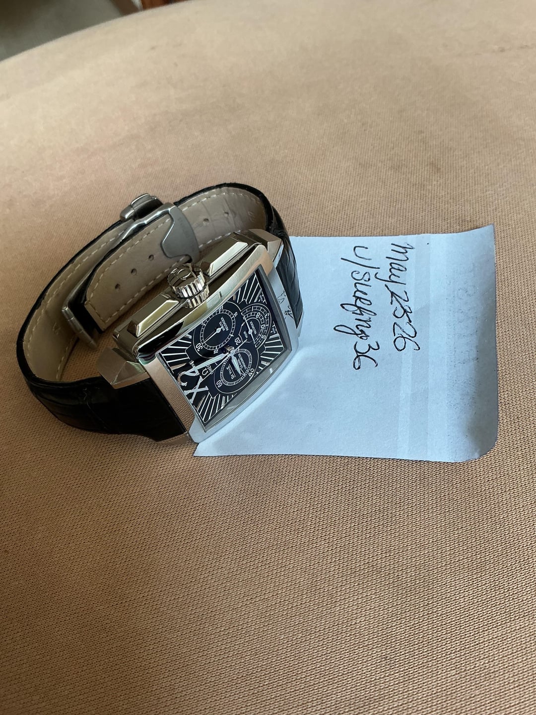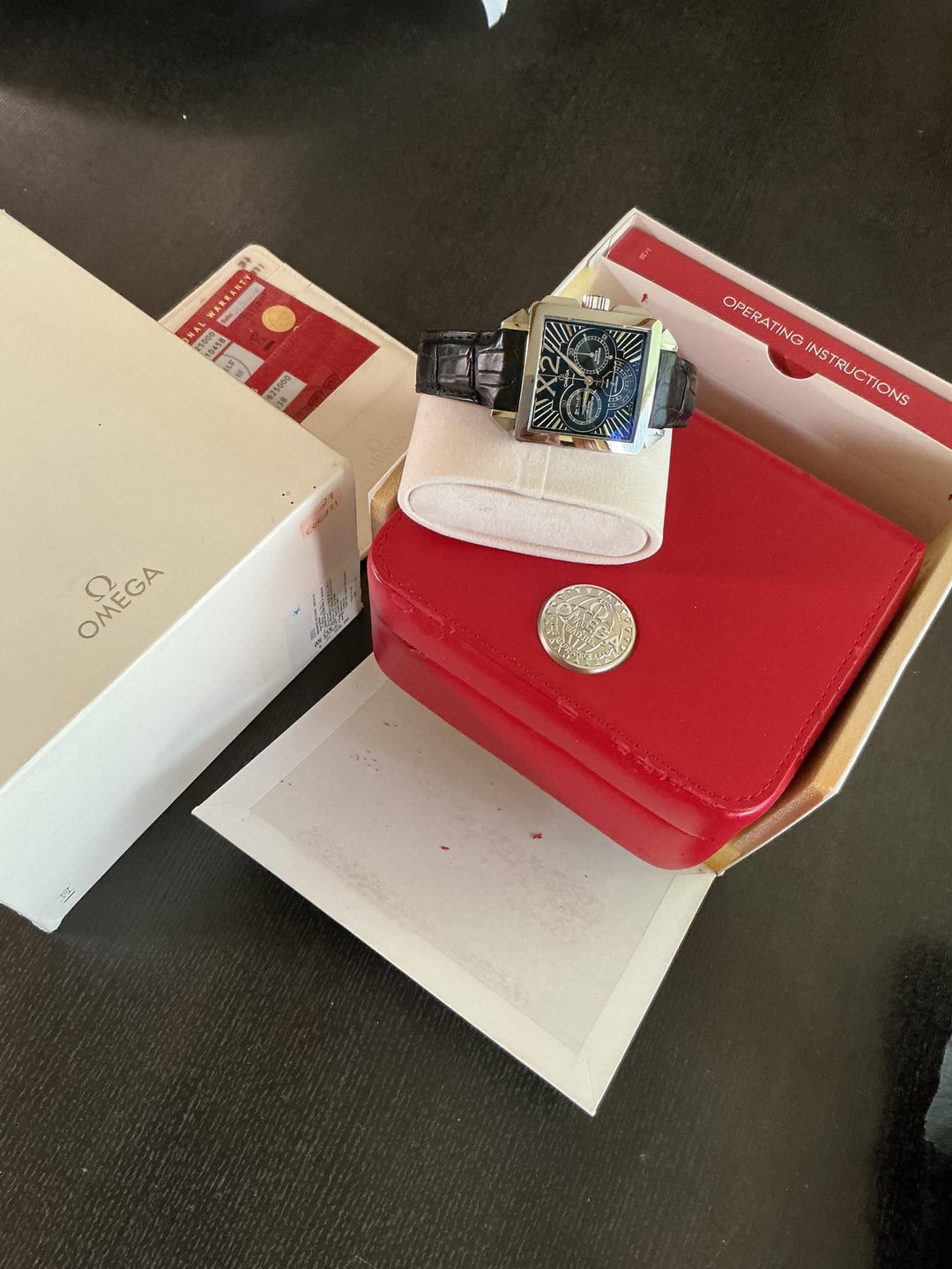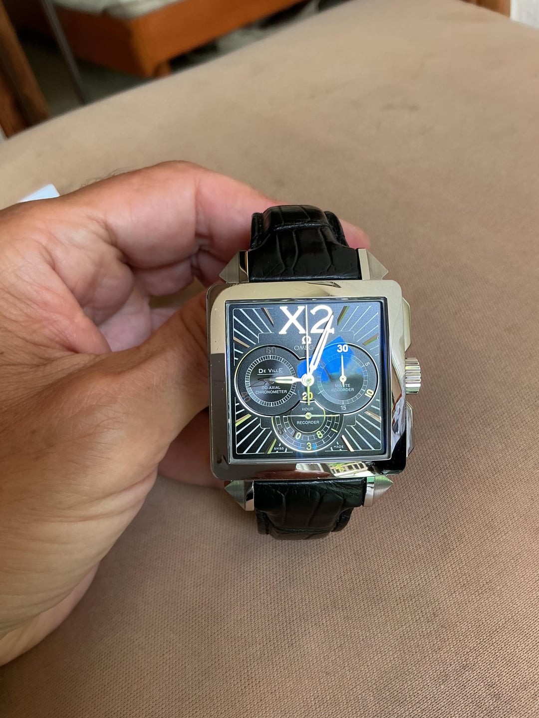 ART DECO Masterpiece. Unusual square Omega AUTO CHRONOGRAPH . 37 mm but where’s bigger. Complete set in great condition. Amazingly beautiful all applied indices , numbers and hands. To big for me . Looking to TRADE for something interesting under 40 mm. Priority to Grand Seiko.