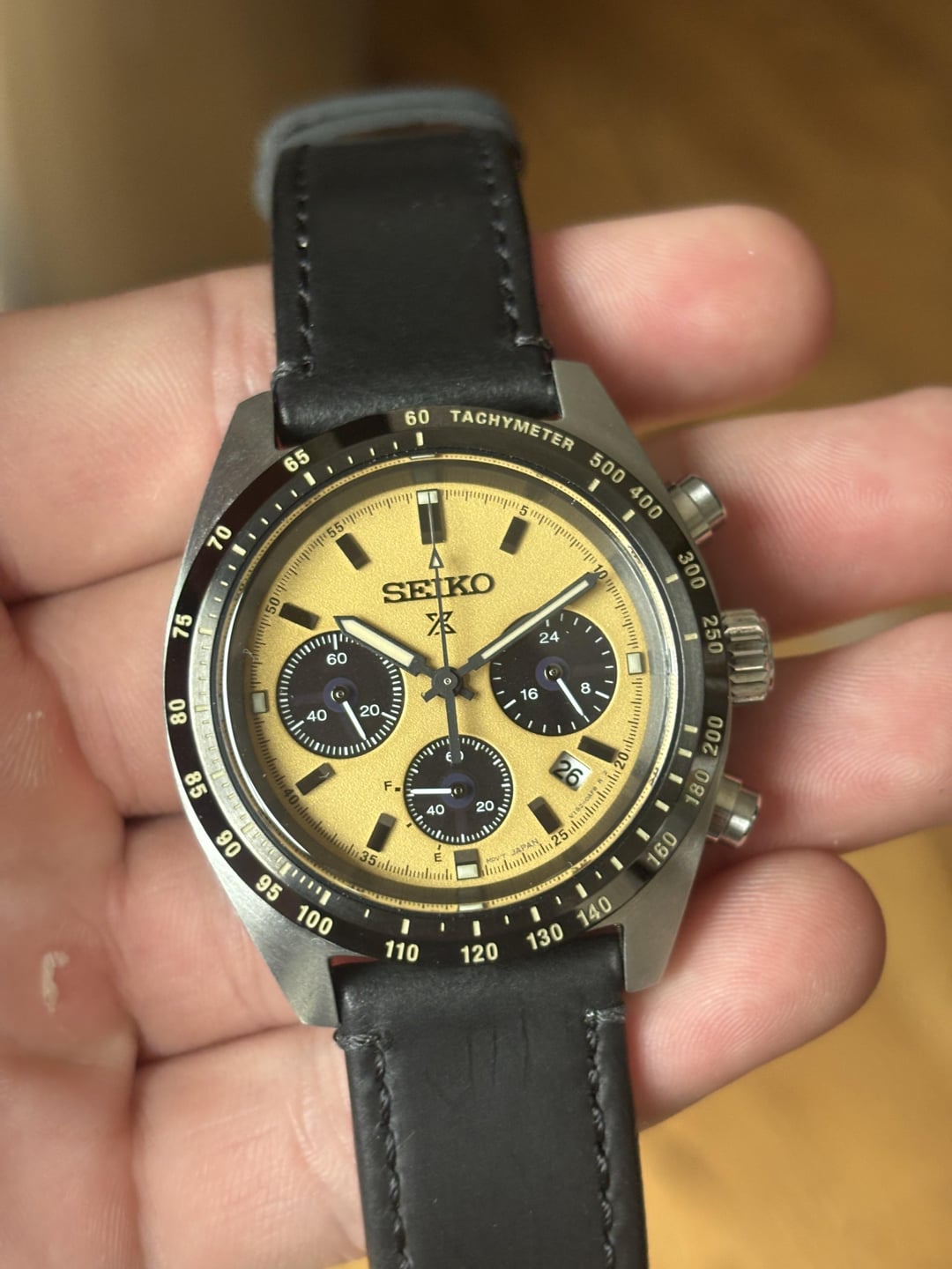 [WTS] Seiko Prospex Speedtimer “Golden Panda” SSC817 – $270 • Condition: Pre-owned, watch only • Details: 39mm stainless steel case, solar-powered V192 chronograph movement, 100m water resistance, curved sapphire crystal, sandblasted yellow dial with black subdials, black tachymeter bezel.  • Payment: PayPal FF, Wire, Venmo, Cashapp • Location: East Lansing, MI • Shipping: CONUS shipping included; international shipping available at buyer’s expense • Trades: Not accepted at this time • Financing available Let me know if you need further information or have any questions!
