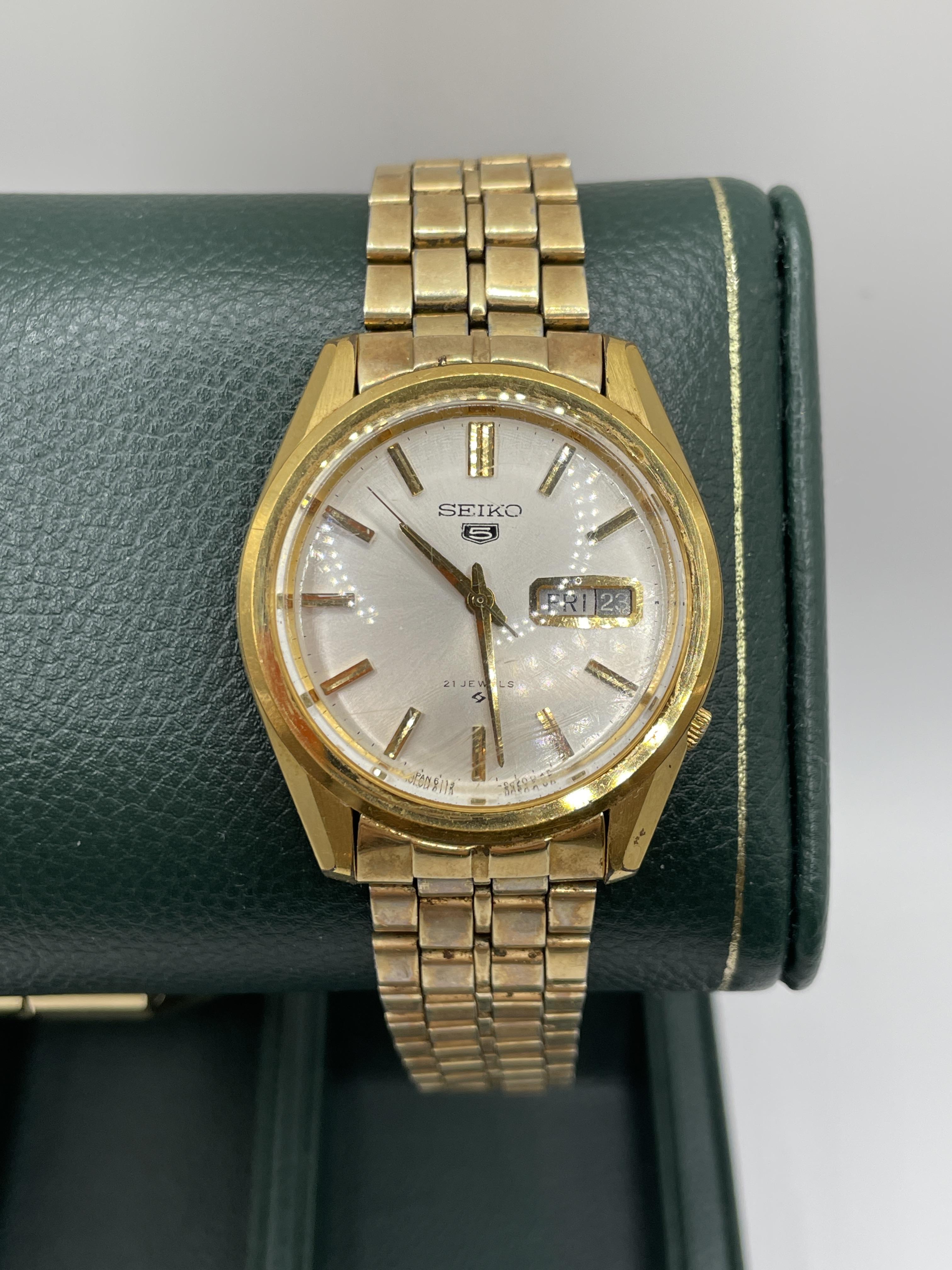 A beautiful gold plated Seiko 5 with all original parts, including original bracelet. Gold plating looks beautiful and faceting on case is still crisp. This watch punches above its weight! The movement is running strong with all functions working. In well-used condition with wear marks on case and crystal. Original bracelet can fit up to a 6 ¾” wrist. Price: $150 USD OBO Imgur and Timestamp: https://imgur.com/a/seiko-sgp-6119-8020-9DstBRi Shipping: 2-day Insured + tracked shipping to Conus. International available Comes with: Watch only