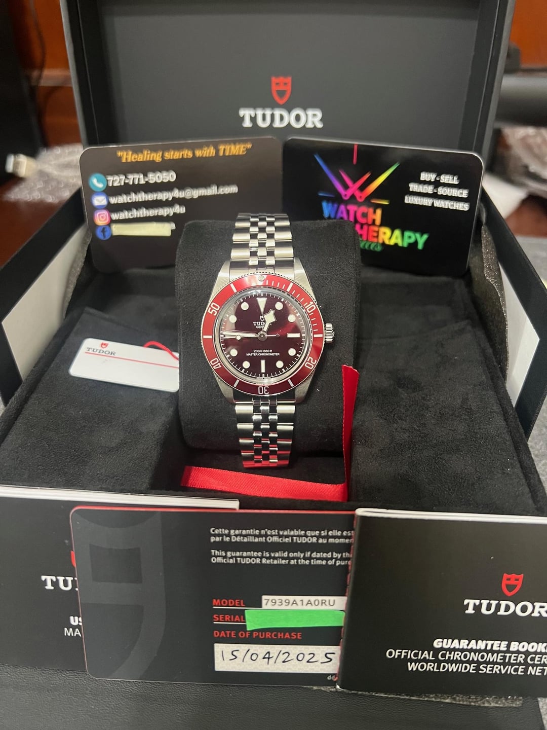**F/S: 2025 New Tudor Black Bay 58 Burgundy Jubilee 4/25 Ref# M7939A1A0RU** **Specs:** \* Burgundy domed dial w/applied hour markers \* Automatic self-winding \* 39mm \* Five-link Jubilee style bracelet with T-Fit clasp \* 200M Water Resistance \* 65-hour power reserve \* MT5400-U COSC/METAS **Includes**: Warranty card 4/25, double boxed, booklets and tag. **Condition:** 9.8/10, unworn, stickered. There are some hairlines on the polished center of the clasp. **Price: $4499.00+ Insured shipping to your local FedEx for pick-up in Con US**. I am also open to a face-to-face public transaction in or around the Tampa Florida Region, within reason. I have many strong and viable references within Reddit and from Buy/Sell/Trade Watch Facebook groups. Always willing to jump on a call or meeting link to show you the watch. Thank you and please reach out if you have any questions or concerns. Florida residents may be subject to sales tax w/o a valid reseller cert. ***No Trades, TY*** **Location**: Tampa Florida **Payment:** Zelle or Wire Timestamp: [https://imgur.com/a/hUrdrvG](https://imgur.com/a/hUrdrvG) FB: Watch Therapy Timepieces IG: [@watchtherapy4u](https://www.reddit.com/u/watchtherapy4u/)