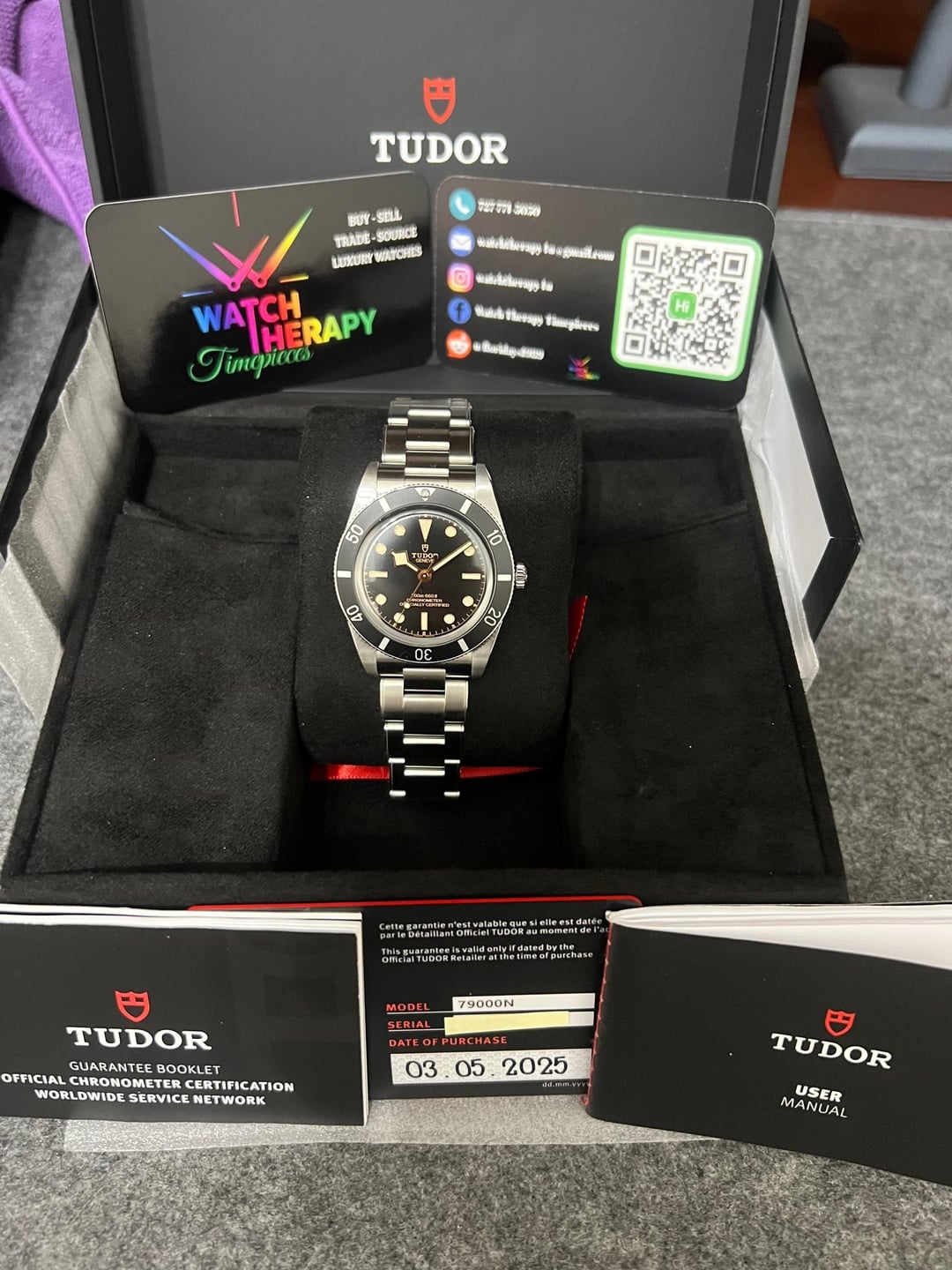 **F/S: New Tudor Black Bay 54 37mm 4/25 Ref. 79000N** **Shipping from Florida.** **Specs:** \* Beautiful black domed dial \* Self-winding \* Size 37 SS case w/SS bezel and aluminum bezel \* Three-link SS bracelet \* 200M Water Resistance \* 70-hour power reserve \* MT5400 (COSC) movement **Includes**: Warranty card 5/25, double boxed and booklets. **Condition:** 10/10, unworn, unsized. **Price: $3,349.00 Firm** [**+**]() **Insured shipping to your local FedEx for pick-up in Con US**. I am also open to a face-to-face public transaction in or around the Tampa Florida Region, within reason. I have many strong and viable references within Reddit and from Buy/Sell/Trade Watch Facebook groups. Always willing to jump on a call or meeting link to show you the watch. Thank you and please reach out if you have any questions or concerns. Florida residents may be subject to sales tax w/o a valid reseller cert. ***No Trades, TY*** **Location**: Tampa Florida **Payment:** Zelle or Wire Timestamp: [https://imgur.com/a/As5VF9A](https://imgur.com/a/As5VF9A) FB: Watch Therapy Timepieces IG: [@watchtherapy4u](https://www.reddit.com/u/watchtherapy4u/)
