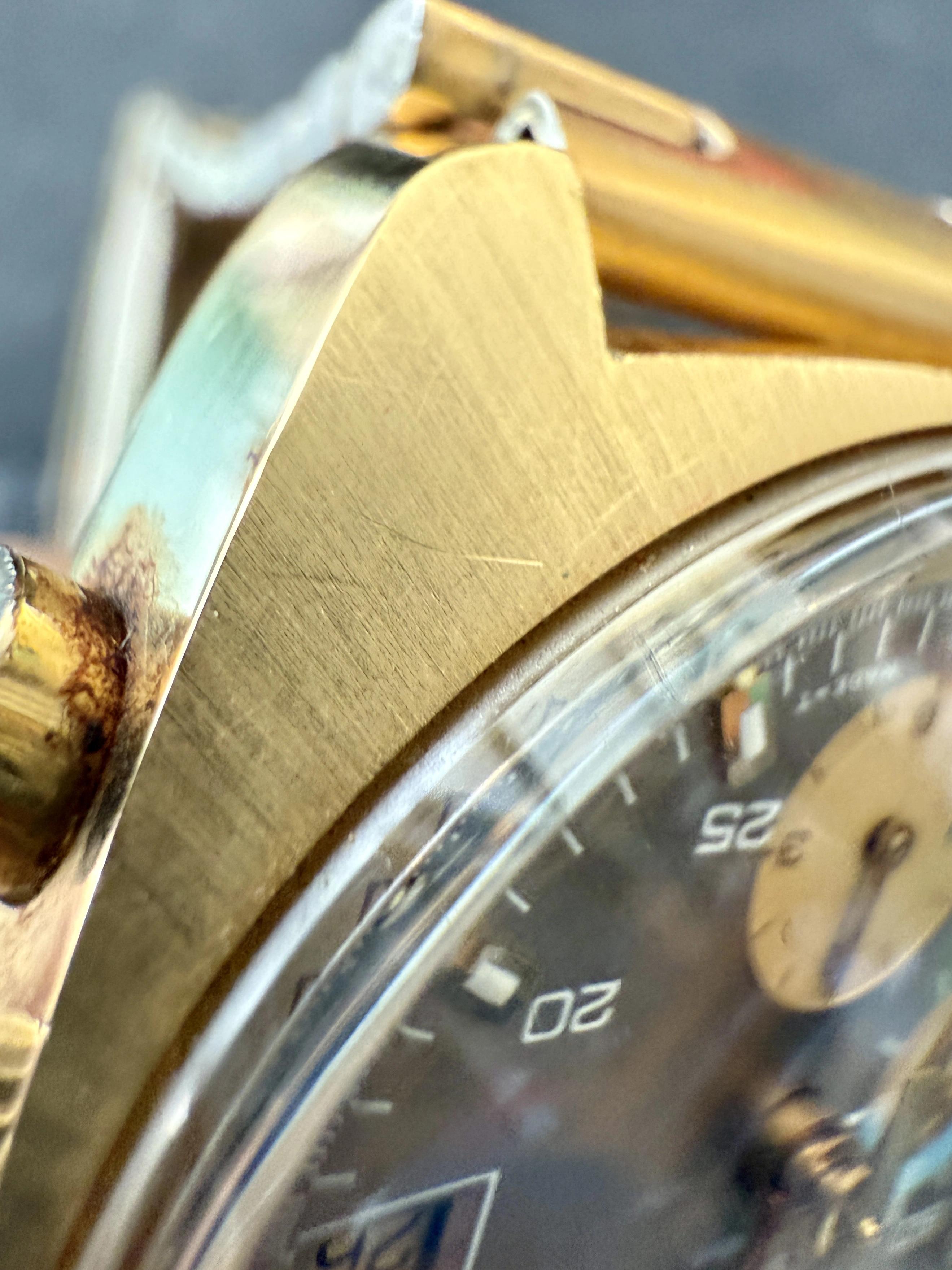 Movement: cal.1040 auto, not serviced in my possession. For the past 10+ years in my possession, I’ve not worn the watch save for photos or 2-3x a morning around the house, unwound. Date wheel clicks through as expected. Winding and time-setting all works as expected. Crono second and minute hands reset to 12 as expected. Based on movement appearance, I’d assume the watch deserves a service were it to be worn/wound with any regularity. (Service was not a priority for me as I largely kept the watch as a great example of an otherwise rare variant.)