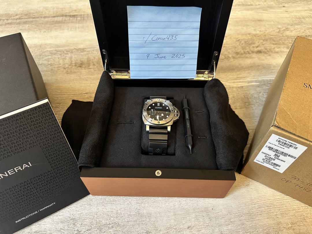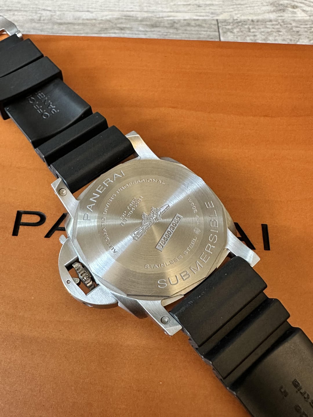 [Timestamp](https://imgur.com/a/panerai-1229-NXfPlK5) Panerai 1229 Submersible QuarantaQuattro. 44mm case, 300m water resistance, in-house automatic movement. Triple boxed and complete with manual, ID card, registration, and warranty card. Minor desk diving scratches but overall in amazing condition. No dents or nicks. Keeps time perfectly within specs. Strap has never been used. Warranty good through September 8th, 2030. I have years worth of positive feedback on RolexForums and watchuseek under this same username as well.