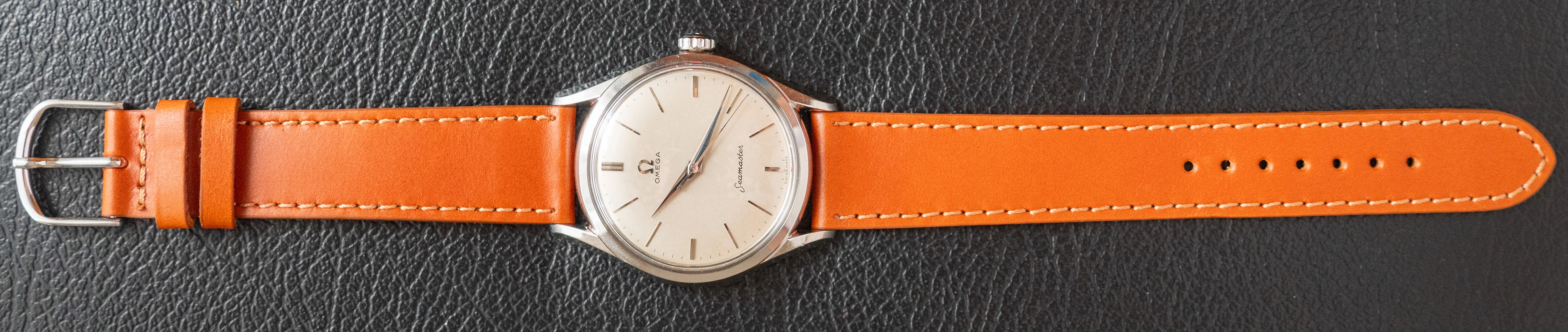 - The watch comes on a brand new aftermarket leather strap.