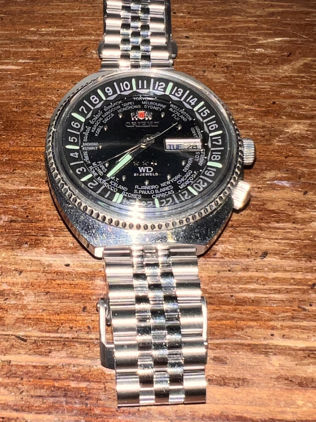 **\[WTS\] Vintage Orient WORLD Time Diver Sea World Automatic Watch, Beautiful Black Dial - for 560$ Shipped 🚢 Via FedEx (MINT Condition!)** I have this beautiful orient world diver, than I only got to wear twice, since I had other watches. Since collecting watches is an expensive hobby and I just acquired a new watch, I have to sell this beautiful baby :) **Quick description:** *MINT Condition with Original Box and wonderful condition.* *Specifications:* \- mechanical Automatic. Japan movement. \- with world timezone \- day and date calendar (have a button for quick date change) \- shockproof \- stainless steel \- measures 43 mm case in diameter without crown \- 21 jewels **Extra Details:** \-Original bracelet included \-Brand new jubilee bracelet (seen in photos) \-beautiful brown leather alligator strap for a dress look. *The watch has been totally serviced by professional watchmaker and keeps great time.* Please message or comment any questions. Open to offers and negotiations :)