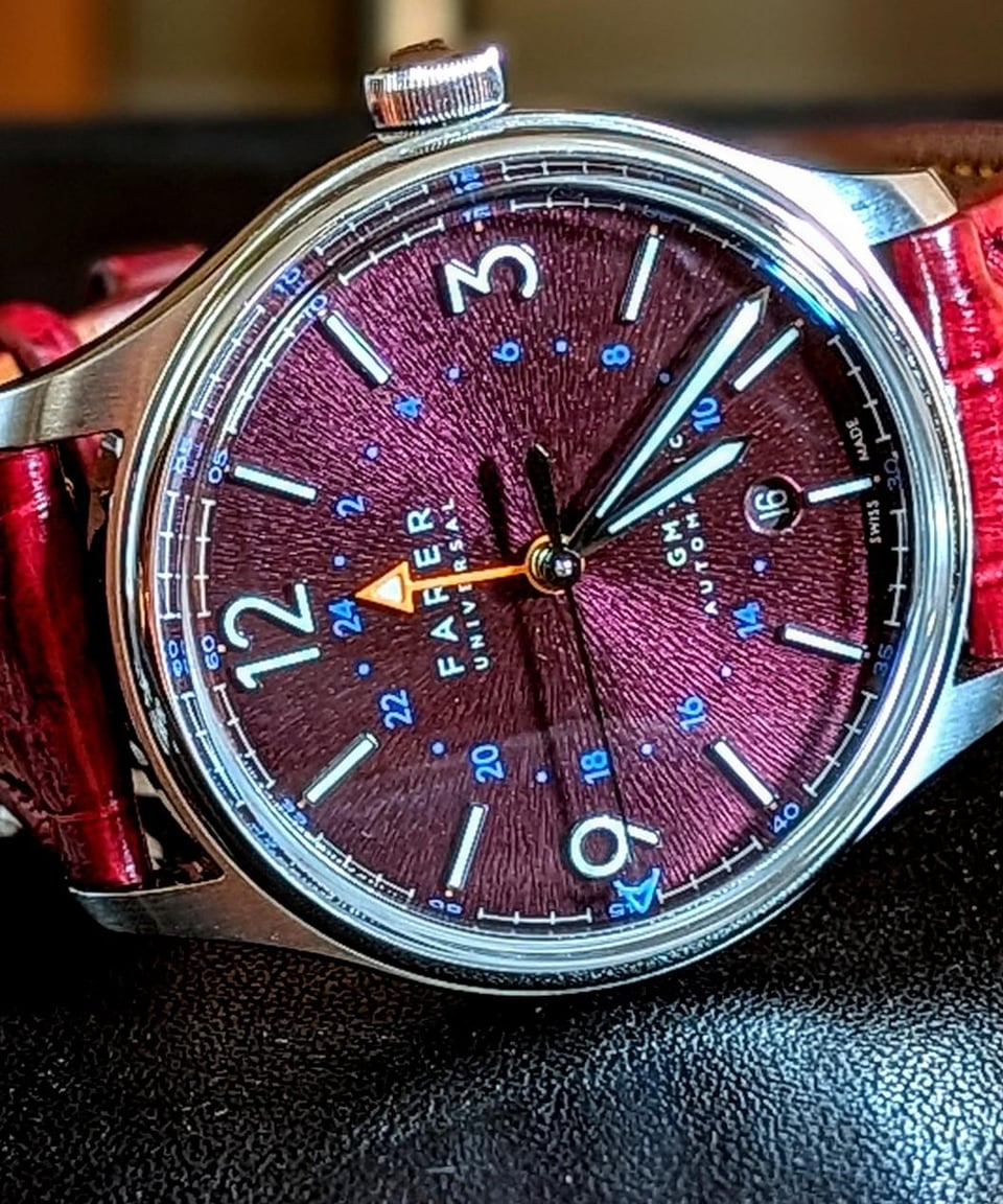 The Farer Banzare is a limited edition, 150 made only, known for its unique textured dial and GMT functionality. It features a deep-ridged sunburst texture stamped into the dial, which is then coated with a transparent enamel polished lacquer, creating a shimmering, bark-like surface that shifts in color depending on the light. The dial reminds me of Grand Seiko Mt Iwate dials. The watch is powered by a Sellita SW330-2 top grade movement and is water-resistant to 100m. I bought this new from Farer last year. It still has 4 years of warranty. Comes with all boxes, short navy OEM straps, and this burgundy crocodile leather. Only shipping in the US. Let me know if you have any questions.