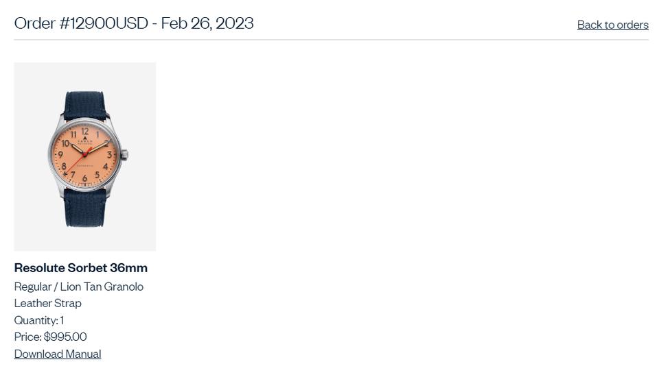 Selling my 2023 Farer Resolute Sorbet 36MM. Like new with case, warranty card, hang tag and microfiber cloth. Worn a dozen or so times at which point I just determined it wasn't for me. Purchased directly from Farer in February 2023 (order pictured in photo 3). Price: $850 + shipping, payment via Paypal Goods and Services with me covering the Paypal fee. Open to reasonable offers.