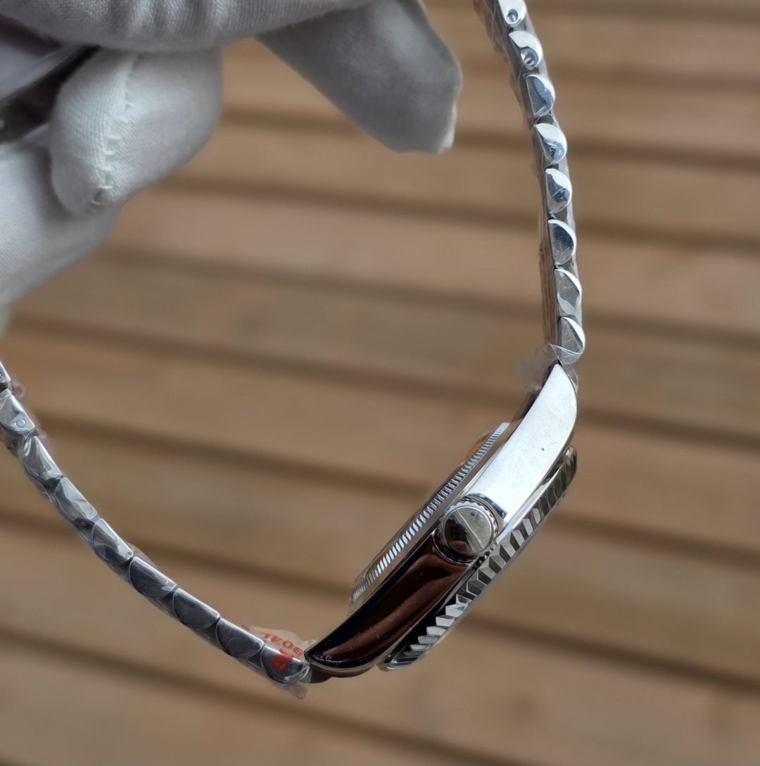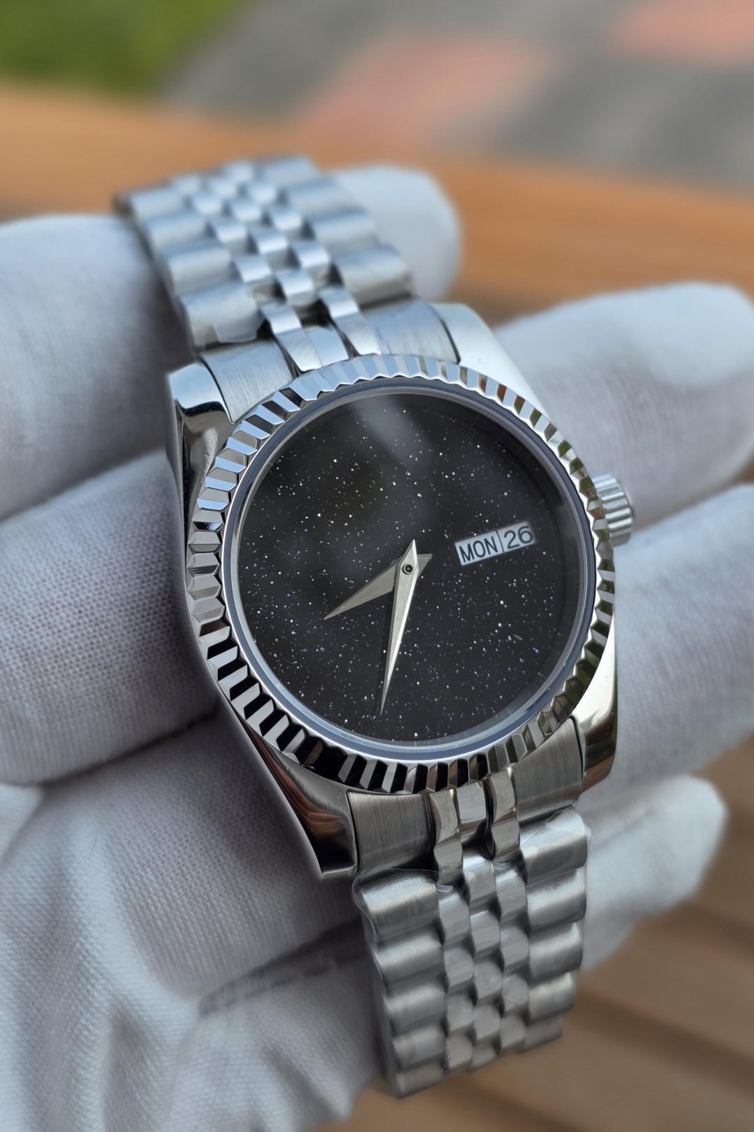 This custom automatic watch is powered by the Seiko NH36 movement, offering reliable timekeeping with a day-date complication at 3 o’clock. The 36mm stainless steel case features a polished fluted bezel for a timeless, dressy look. The real standout is the aventurine-style dial, a deep black backdrop with shimmering flecks that evoke a star-filled sky. Clean and minimalist with no indices or branding, it keeps the focus on the beauty of the dial. Polished sword-style hands add sharpness and elegance. Key Specs: * Movement: Seiko NH36 (automatic, hacking, hand-winding) * Case Size: 36mm diameter * Thickness: ~11.5mm * Lug-to-Lug: ~43mm * Lug Width: 20mm * Water Resistance: Tested to 60m * Crown: Screw-down * Caseback: Exhibition (clear) * Bracelet: Jubilee-style with screw-in links and solid end links $200 CAD + Shipping ($25 USD) or face-to-face pickup in Winnipeg, MB, Canada Payment via e-transfer, PayPal, or Wise Video: https://imgur.com/a/RfS8Yey Timestamp: in the last pic