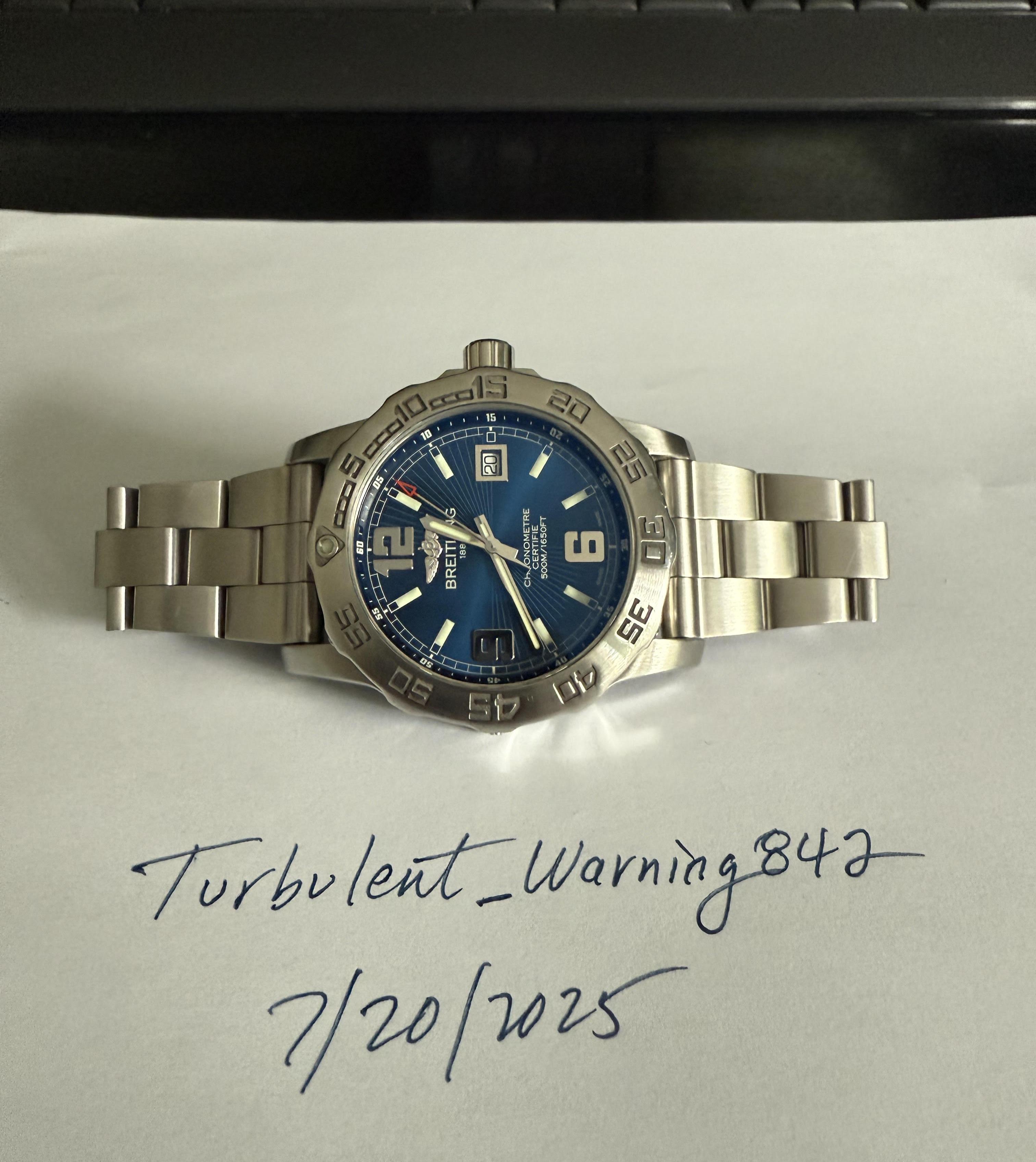 I am selling my Breitling Colt 44mm model A74387. The watch was fully serviced in Nov 2023 that included a replacement of the crown and sapphire crystal. Sale includes OEM blue calfskin leather strap with tang buckle in like new condition. · Original box and papers · Superquartz movement B74 · Sunray blue dial with Arabic numerals · Date display · Stainless steel case · Stainless steel bidirectional bezel · Water resistance up to 500 meters · 22mm lug with · Bracelet tapers to 18mm · Includes OEM blue calfskin leather strap in like new condition · Watch is sized for a 7.25 inch wrist and includes an extra link This is my first sale, so I am happy to schedule as many Facetime sessions as you would like so that you can get comfortable with me as a seller. $2,300 shipped via USPS registered mail fully insured, to the CONUS or arrange pickup from the Boston, MA area. PayPal Goods and Services or bank wire accepted. Gallery: