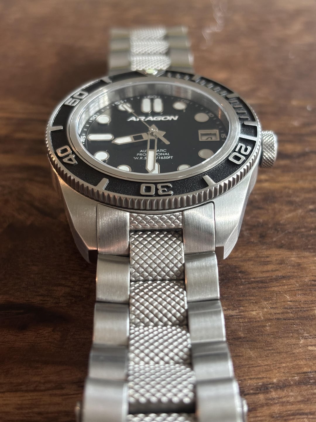 Hello! Relisting an Aragon DF 40 in black, at a reduce asking price. Sturdy, reliable diver with an engraved stainless steel bezel and unique texturing on the stainless steel bracelet. Initial movement was a loser of the Seiko lottery, running too slowly out of spec. Watch has since been sent to Aragon for regulation/replacement, and is now keeping good time. Watch is in excellent shape, with the only discernible blemishes to my eye being very minor desk diver hairlines on the clasp. Watch comes with full kit as shown in timestamp, including: watch/bracelet, box, and user manual. Watch comes sized for a \~7.25" wrist, along with two remaining links. Additional info and a link to Aragon's site below (for reference): — Case Size: 40mm — Case Thickness: 13mm — Lug Width: 20mm — Crystal Material: Sapphire — Water Resistance: 500m, with screw down crown and helium escape valve — Movement: NH35, behind a display caseback Timestamp: [https://www.flickr.com/photos/199566568@N08/54657841060/in/album-72177720327566502](https://www.flickr.com/photos/199566568@N08/54657841060/in/album-72177720327566502) [https://www.aragonwatch.com/ARAGON\_DF\_40\_NH35\_p/a638blk.htm](https://www.aragonwatch.com/ARAGON_DF_40_NH35_p/a638blk.htm) Asking **~~$120~~** **$99** shipped within the CONUS. Preferred payment methods are Venmo, Zelle, or Paypal F&F. Please feel free to reach out with any question