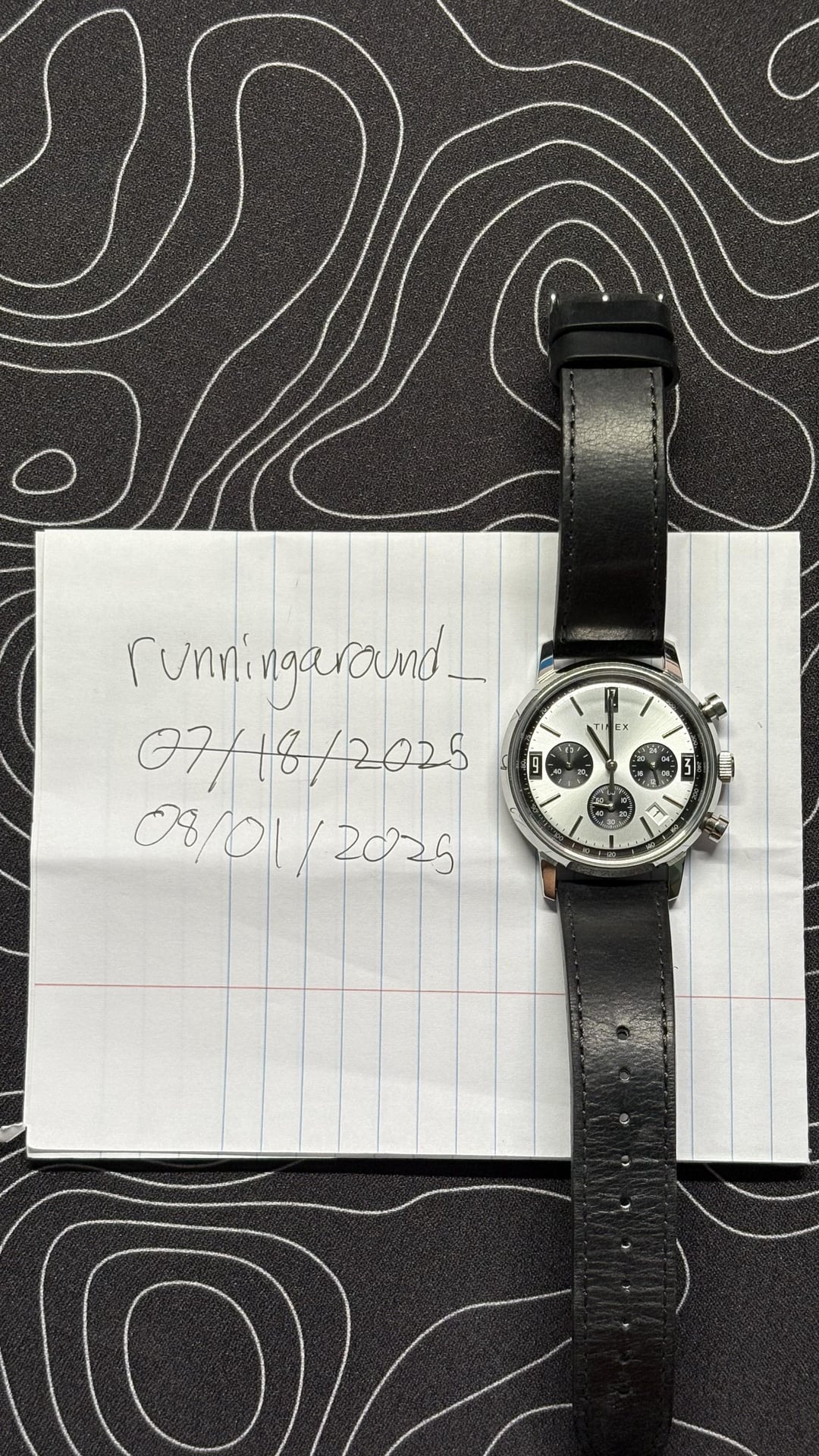 Hello people of [r/WatchExchange](https://www.reddit.com/r/WatchExchange/) !  I am selling a few watches today to consolidate my collection.   A few general notes:  * All watches will be shipped via USPS Priority. U.S. shipping only.  * All watches are used; some more than others.   * Unless shown in photos, the watches are all in great condition. I have made the effort to photograph all OBVIOUS flaws on my watches. Of course, I am human, and may miss some little scratches or scuffs here and there.   * Shipping is included in the price you see.   * Please inform me if you would like to have your watch signed for at delivery.   * If you want extra shipping insurance, please inform me, and I will ask USPS what they offer and how much. Buyer pays extra fees.   * Preferred payment Venmo family & friends. If you wish to pay me as a business, you will cover the 2.99% fee. This will be calculated after we come to an agreement.  Now, here is some info on the watch: *   Model: Timex Marlin Chronograph REF TW2W10300 *   Year: 2024 *   Movement: Quartz Analog *   Crystal: Acrylic  *   Condition: Good. Scuff on downward slope of the crystal (as shown in photos). This does not affect view-ability in any way.  *   Dimensions: 40mm case width, 20mm lug width  * Contains: No box, no papers, Timex strap.  MSRP (Thru Timex) $209 ASKING $120 (OBO)