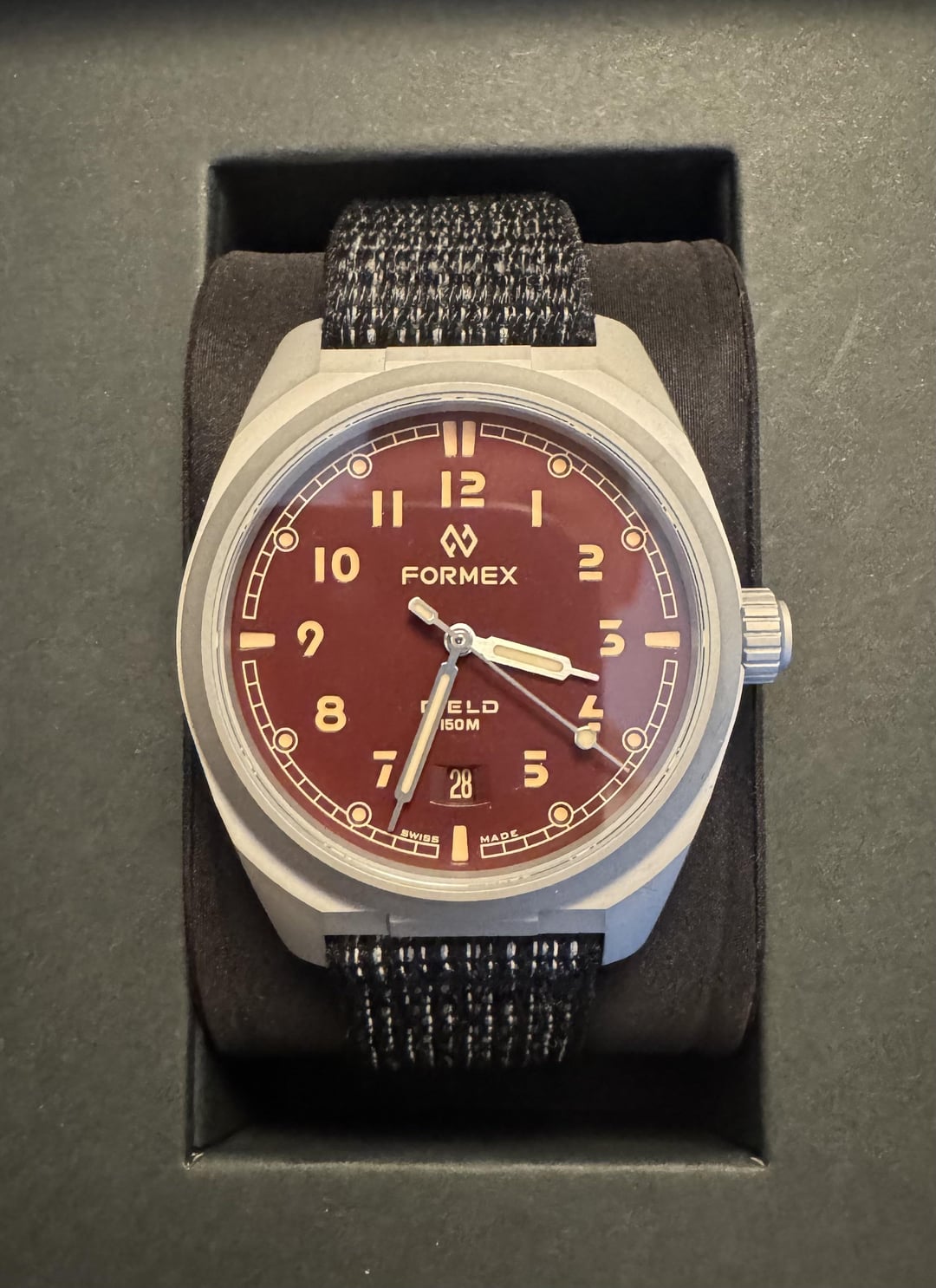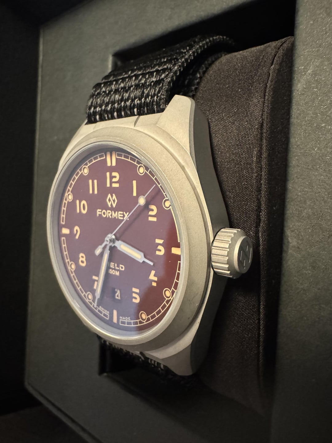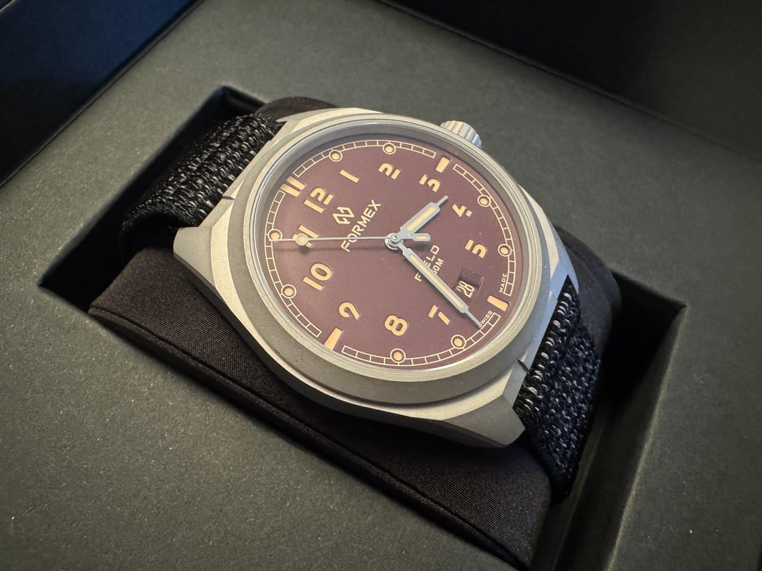 Selling my Formex Field Mahogany because I also have a blue one and just don’t need two. Purchased April of 2024 and lightly worn in a larger rotation. Excellent condition, very light titanium patina. Comes with full kit on the black Formex fabric strap. The Field is hands down the most comfortable watch I’ve ever worn, and personally I prefer their fabric strap to the leather that my blue one is on. $650 shipped CONUS, PP F&F or G&S if seller pays the 3% fee. Will ship will not ship to locations flagged by mods as being associated with scams. Thanks for reading!