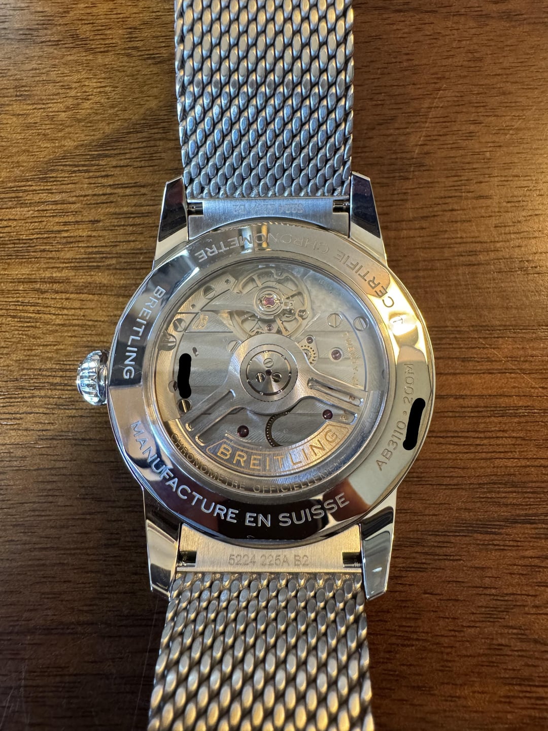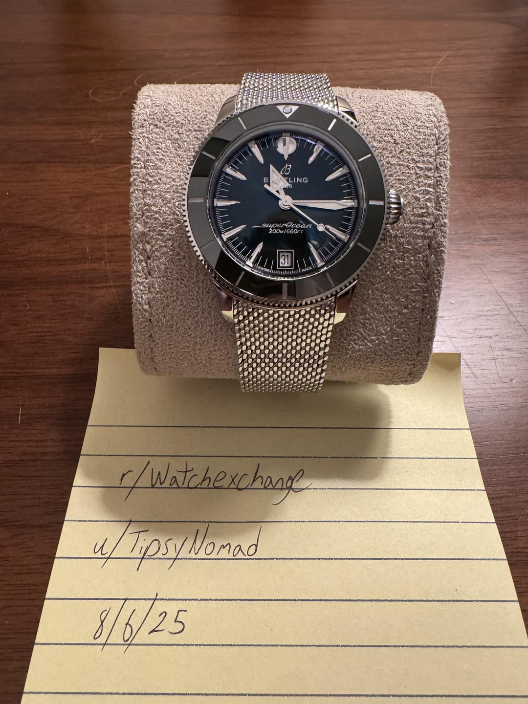 Breitling Superocean Heritage B31 Automatic 40 - Green Reference Number: AB3110361L1A1 Timestamp: [https://imgur.com/NVGPnSI](https://imgur.com/NVGPnSI) Pictures: [https://imgur.com/a/breitling-superocean-heritage-b31-40mm-green-8u9akaP](https://imgur.com/a/breitling-superocean-heritage-b31-40mm-green-8u9akaP) This B31 movement Superocean Heritage took the charm of the previous generation and perfected it. Its beautiful sunburst green dial and vintage style bezel gives a classy vibe to an overall fun style of watch. The watch is thin, light, and wears extremely comfortably thanks to its curved lugs and phenomenal mesh bracelet. The links blend well into the main mesh portion of the bracelet and are a clever way to avoid added bulk of overlapping mesh straps. There are very few used, if any of the latest Breitling Superocean in 40mm available, so this is a great opportunity to grab this watch at a greatly reduced price! What's included: Watch, outer and inner box, manual, 5-year warranty card dated June 2025. Breitling water bottle (unused) Condition: Fantastic condition. There are some hairline scratches on the clasp that can only be seen if you’re really looking for it in the right glancing light. There’s also a couple really faint hairline scratches on the case that are basically impossible to see unless your nose is against the watch. Price: $5250 w/ shipping included. US only Payment Method: Zelle, Paypal, Venmo Happy to answer any questions!