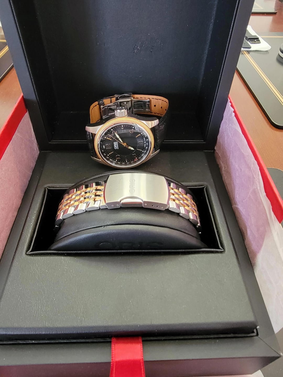 REF: 01-754-7679-4334-07-8-20-32 Up for sale is my Oris Big Crown Pointer Date. This reference is two-tone rose gold. Has never been worn on the bracelet. Presents as new. I have been collecting for 30 years and wish to reduce the number in my collection. Asking $999 via bank wire. NO TRADES. Would consider PayPal FF for interested parties with good feedback. [https://imgur.com/a/9nbMR6X](https://imgur.com/a/9nbMR6X) Oris webpage: [https://www.oris.ch/en/watch/big-crown-pointer-date/01-754-7679-4334-07-8-20-32](https://www.oris.ch/en/watch/big-crown-pointer-date/01-754-7679-4334-07-8-20-32)