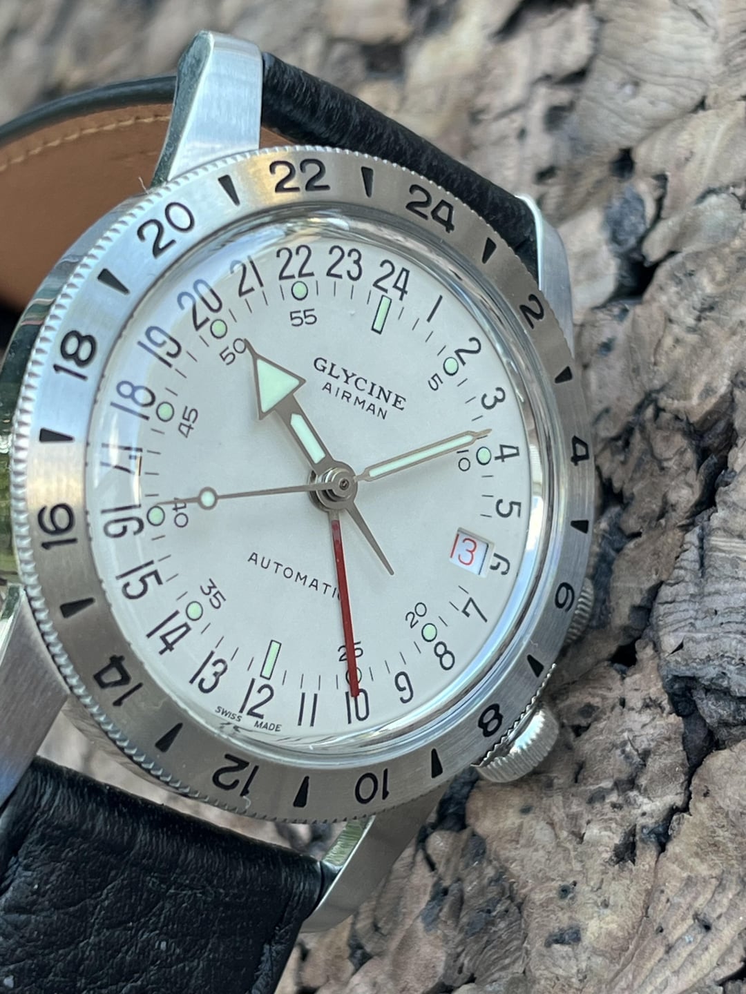 Asking $475 (CONUS shipping on me, fees if any on you) * Watch is in excellent condition, full box/papers + stamped warranty card (expired) * Measurements: 36mm diameter, 20mm lug width – wears like a Rolex Explorer 36! * Other details: ETA2892, automatic, domed acrylic crystal, stainless steel case, white/beige with a date wheel with red numbers (!), rotating 24 hour bezel with lockdown via lower crown.  The GMT hand was painted red by a watchmaker, and I think enhances readability, but your tastes may vary.  Timekeeping is excellent, and about +4/+5s per day. *   * This watch is the Ref GL0160, or the original LE of 1000 with the acrylic crystal.  The closest current version of this watch is the Ref GL0372, and information is shared on that one: * Manufacturer Site: [https://glycine-watch.ch/watches/gl0372-airman-vintage-unisex](https://glycine-watch.ch/watches/gl0372-airman-vintage-unisex) * Online Store: [https://www.glycinestore.com/glycine-airman-no1-gmt-36-gl0372/](https://www.glycinestore.com/glycine-airman-no1-gmt-36-gl0372/) * Hodinkee Review: [https://www.hodinkee.com/articles/the-glycine-airman-no-1](https://www.hodinkee.com/articles/the-glycine-airman-no-1) * Includes * \--- Watch * \--- on the unused OEM strap and buckle, watch was rarely worn on a different strap * \--- Full boxes and papers (inner box, outer box, papers, hangtag, stamped warranty, original receipt) – this has the LE wooden box with the address markings and even the wire to close the box. *   * I’m a private collector slimming my collection down and have 100+ transactions on WatchExchange – and I’m happy to talk to you on the phone or FaceTime once you are sure you’d like to proceed.  Straight sale strongly preferred and priced to reflect this.  Thank you for reading my post, and thanks also to the Mod community on WatchExchange.