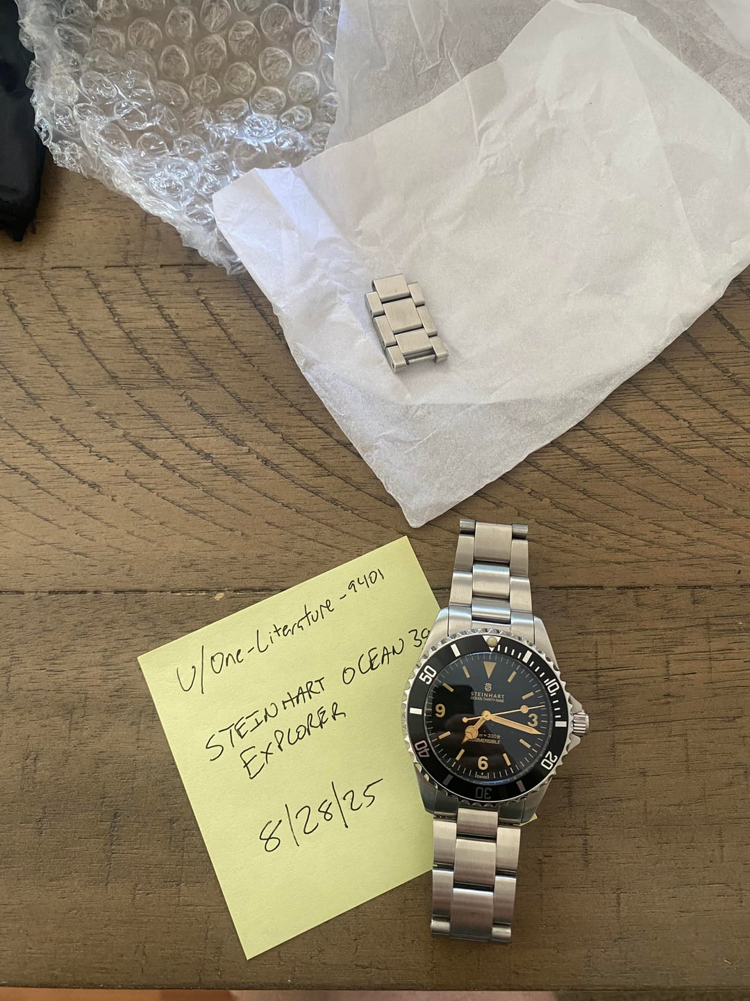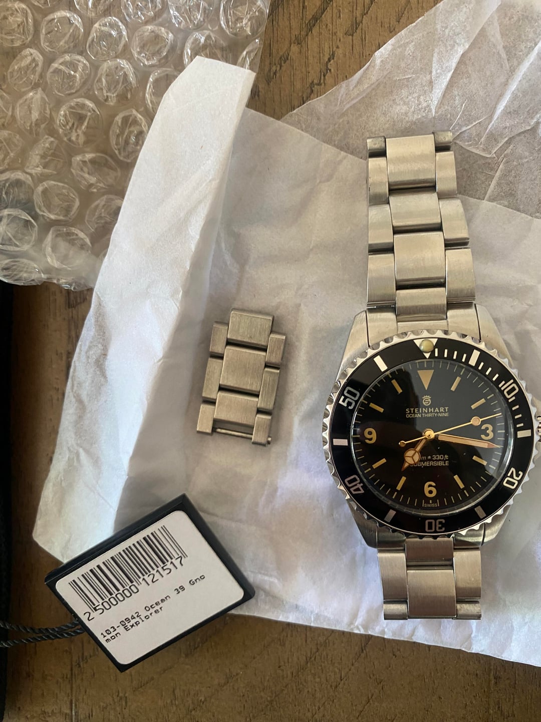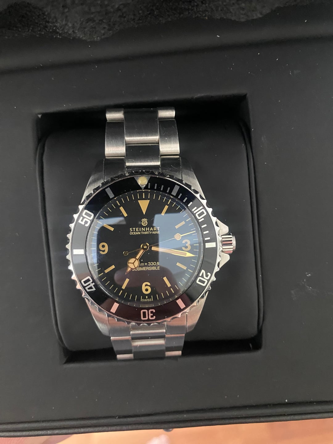 Asking $285 shipped CONUS. This is a catch and release for me. Beautiful watch, just too small for my taste. Copy and paste description from the original listing: Steinhart ocean 39 explorer - Comes with complete kit, double boxed and all extra links! This one has a unique explorer dial on a diver with nice proportions. Gilt hands and numerals. Gnomon exclusive.