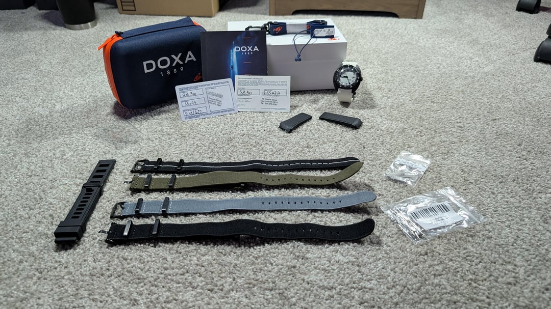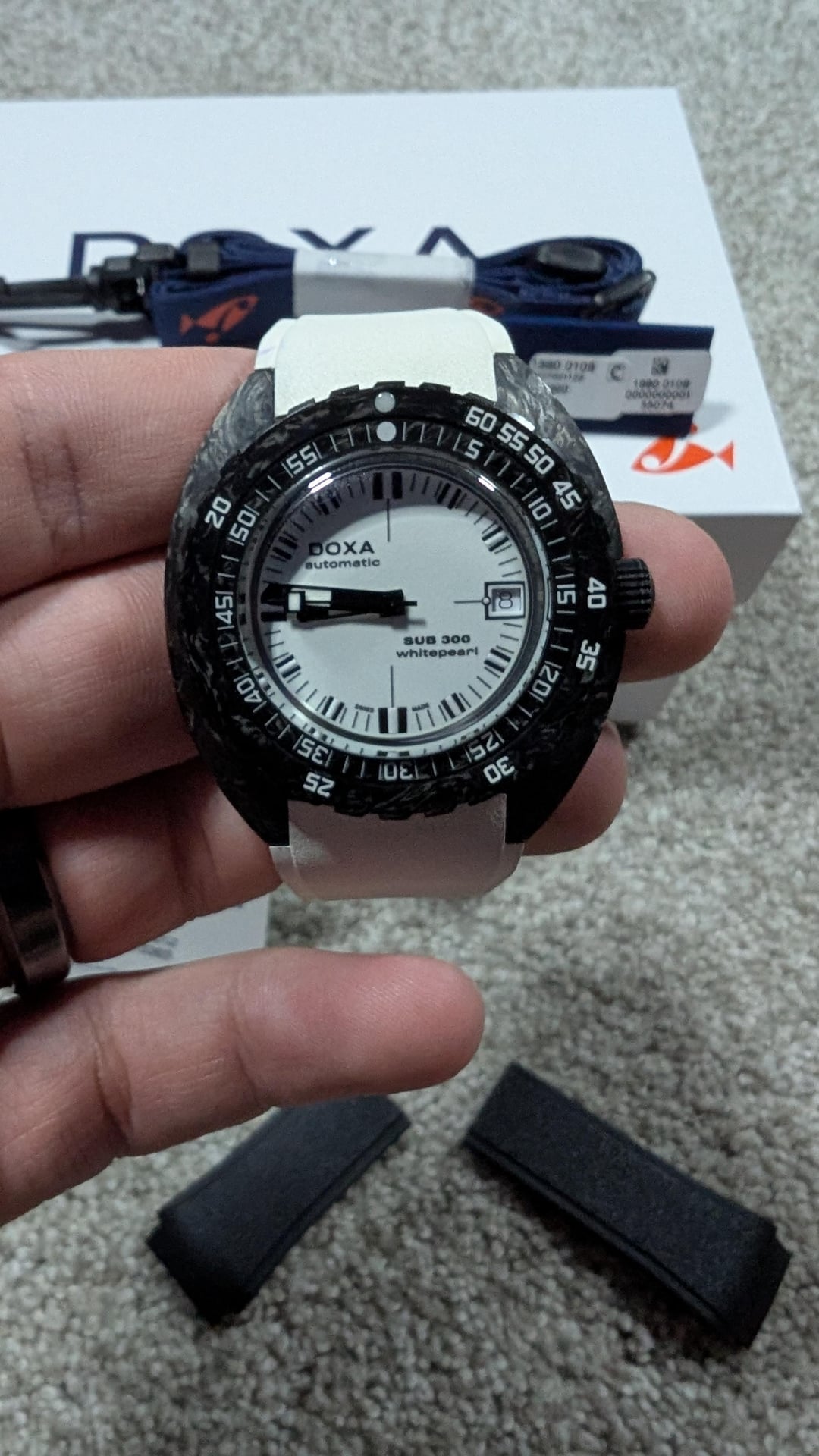 Up for Grabs is my Sub 300 Carbon in Whitepearl. Price: $1899 Payment: Paypal (add 3% for G&S) Shipping: Fully Insured by me. CONUS only Description: Original box and papers, along with 4 elastic NATOs (2 modified into single pass), Will also toss in some quick release spring bars, and some regular spring bars as well. White Doxa Rubber strap is cut to about a 7 inch wrist. Black Doxa rubber strap is cut to about a 6.5 inch wrist. On the fly adjust will give you about 1/2 inch to work with. Dial is fully lumed. There is damage to case around 8:30 position, which also goes down onto the side of the case. I tried to capture as best I could in the pics. I've been able to mask it using a matte base and then seal it with a matte clearcoat. Happy to include these as well with the shipment if requested. Not sure how matte base and clearcoat will respond to water if exposed. Damage only shows up in certain lighting due to the marbling and matte finish of the matte case. Besides this, there are some minor knicks, and some scratches on the back around the lugs from strap changes. Otherwise, watch is in good shape. Still running to COSC standards. Had the bezel and crown replaced in March of 2025 and had a partial service preformed by Doxa, so warranty is good until March of 2027. Will include original bezel and crown as well. Happy to answer any questions, and provide additional pics upon request. Videos I made on this watch: My Review: [https://youtu.be/upSygR2eshc](https://youtu.be/upSygR2eshc) How I damaged it: [https://youtu.be/iERezk0bg40](https://youtu.be/iERezk0bg40) Additional Straps: [https://youtube.com/shorts/pWDxRq1\_u-I?feature=share](https://youtube.com/shorts/pWDxRq1_u-I?feature=share) [https://youtube.com/shorts/NHrOvbJO0tE?feature=share](https://youtube.com/shorts/NHrOvbJO0tE?feature=share) [https://youtube.com/shorts/ZBTU9YSE9So?feature=share](https://youtube.com/shorts/ZBTU9YSE9So?feature=share) [https://youtube.com/shorts/TuygHwwGhco?feature=share](https://youtube.com/shorts/TuygHwwGhco?feature=share)