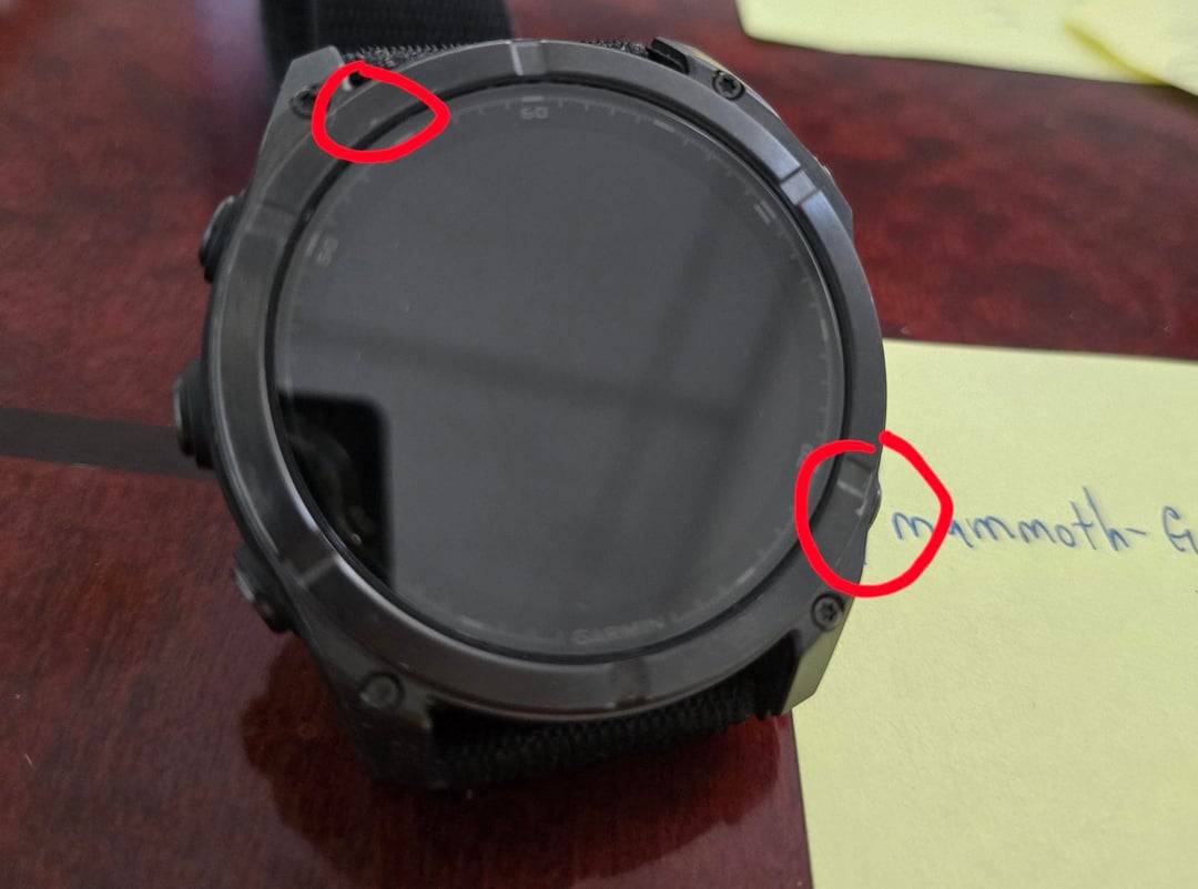 51mm Sapphire Titanium model. Includes Garmin Nylon band, Garmin Silicone band, and charger. Two small dings on bezel which are circled in red on the last photograph. Otherwise, great condition.