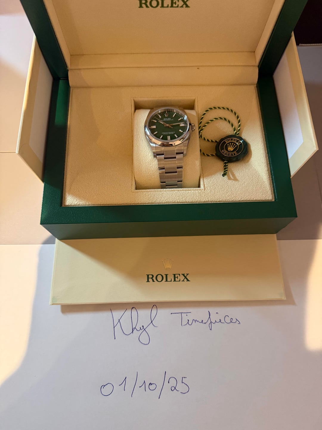 **For Sale: Rolex Oyster Perpetual 36 – Green Dial (Ref. 126000)** Discover the timeless elegance of this **Rolex Oyster Perpetual 36**, reference **126000**, featuring a striking green dial — a modern classic blending simplicity and prestige. **Details:** * Reference: 126000 * Year: 2023 * Size: 36 mm * Stainless steel Oyster case & bracelet * Green dial * Rolex automatic movement * **Condition:** Brand new, never worn * **Full set:** Box, papers, international warranty card  **Price: €8,200** **Location: Belgium** 📩 **Contact us via DM** to reserve this exceptional piece.
