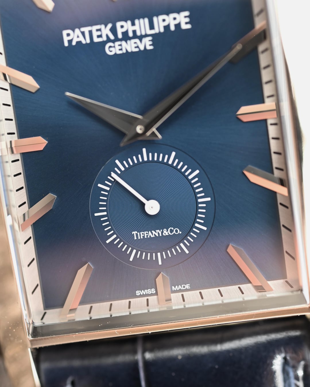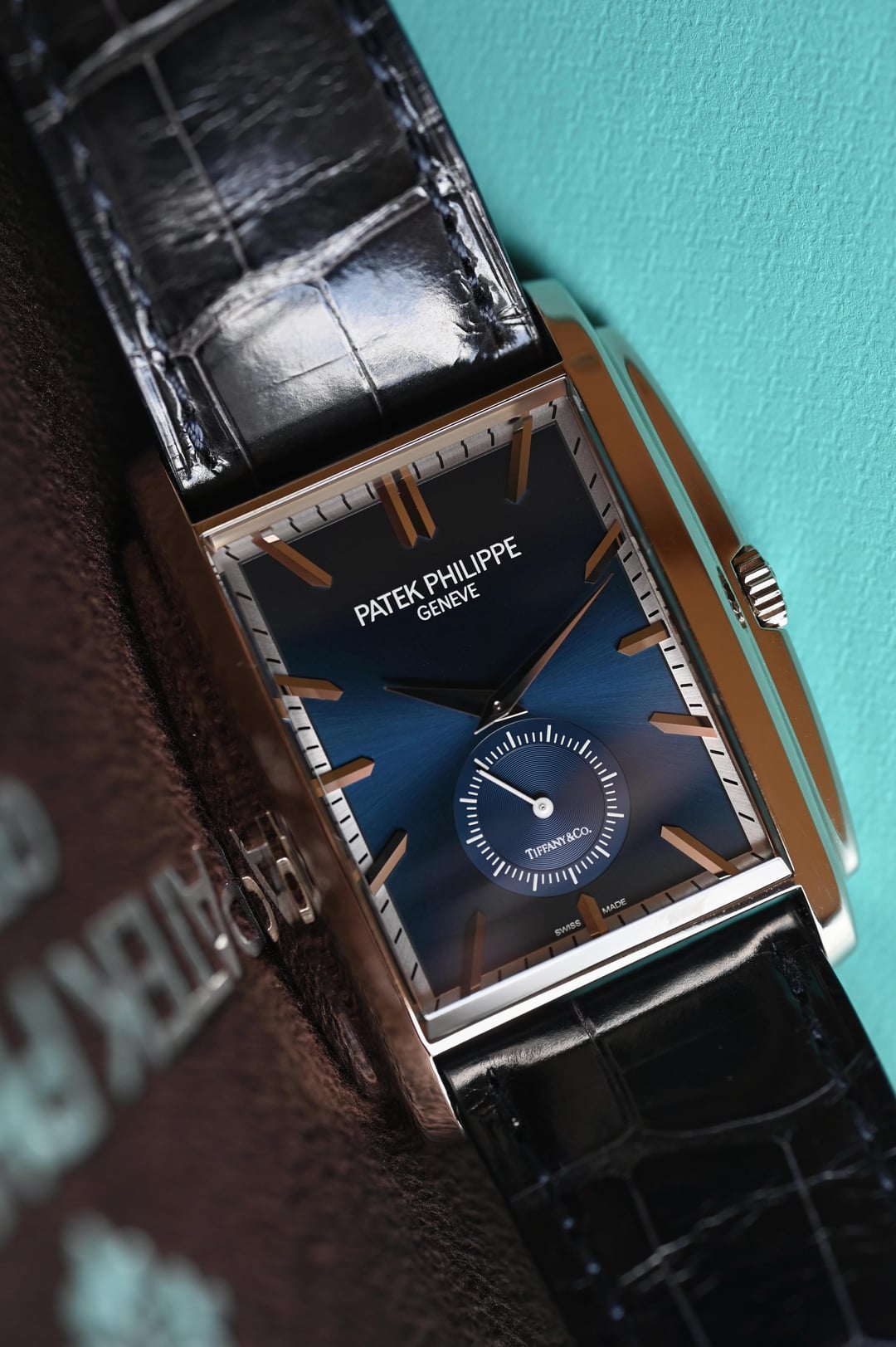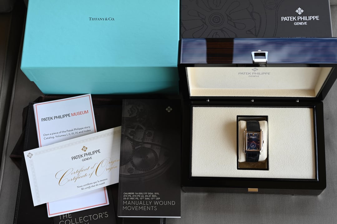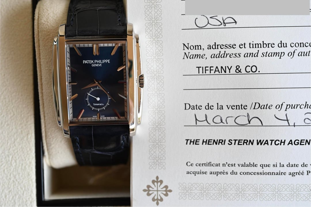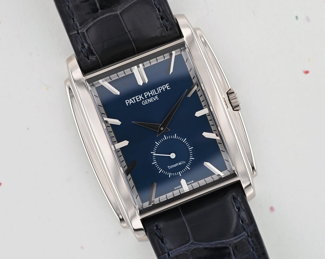 The reference 5124G-011 Gondolo was launched at Baselworld 2015 and here we have a like new, appearing to never have been worn (save for my listing photos), example making for an already special offering of “deadstock”, now ten years on. Then, let’s take it decidedly further with a Tiffany & Co. stamped dial, box, and paperwork, making it possibly the first in this configuration to come to market (please DM if you’ve found another blue Tiffany dial), and you can start to see this is a truly special offering. Taking a more objective look, the 5124 is very interesting; the caliber 25-21 REC PS was the brand’s first non-round caliber since the famous caliber 9-90 and clearly honors the legacy of the storied calibers before it with a classic architecture, layout, and finishing, modernized with the Gryromax balance. The art-deco inspired case wears remarkably well thanks to its curved profile and just 7.5 mm thickness. The dial is certainly no slouch and the finishing and construction feels luxurious at first glance with highly polished and faceted hands and indices laid into the contrasting outer minutes track and the highly dynamic soleil or sunburst blue. The blue dial ranges from a saturated, stoic, rich navy to a bright almost cornflower blue in direct sunlight. The slightly sunken petite seconds dial with concentric circle finishing completes the traditionally high-finished package. If the typical wisdom of something that’s well made but largely overlooked when released often lends to future collectability holds true, then the 5124 is certainly a strong candidate with this specific offering making the most compelling case with the added benefit of the Tiffany signature and full signed set and shop-worn-at-most excellent condition. **Case:** The 33.4 x 42.5 x 7.5 mm solid white gold case is in excellent condition throughout, exhibiting ‘shop’ or ‘display’ wear, at most. The stepped wings flanking the sides of the case ensure it hugs the wrist exceptionally well and doesn’t fall victim to some watches that suffer from being ‘too thin’. The whole case is arched to wear comfortably and beautifully, and make it so much more than just a rectangular watch. **Dial:** The sunburst blue dial is highly versatile and playful with light with a wide range of dynamic blues that really allow the high polished and faceted indices and hands to shine and prominently stand out and further connect the dial to the case design. It is free from any defects and becomes truly special with the inclusion of the Tiffany & Co. signature in the petite seconds dial. **Movement:** The manually wound caliber 25-21 REC PS movement is winding, setting, and running smoothly at approximately -1.8 s/d, averaged across 6 positions. The watch has a classic Patek Calatrava architecture with prominent Cotes de Geneve, anglage, and Patek seal. **Strap:** The watch is presented on its original signed navy alligator strap in standard 75 x 115 mm length with matching white gold pin buckle. **Includes:** A full set complete with Tiffany & Co. outer box, Patek Philippe out box, wooden box with felt cover, leather document folder with museum brochures, manual, and Tiffany & Co. stamped certificate of origin with a March 4, 2022 date of sale. Price: $35,000 USD including fully insured shipping to a FedEx office location or commercial address within the continental US, international shipping available at cost based on location. Payment by ACH or wire, no trades please. I have all positive references here, C24, forums, and Instagram (@)meticulist. Thanks mods for the space.