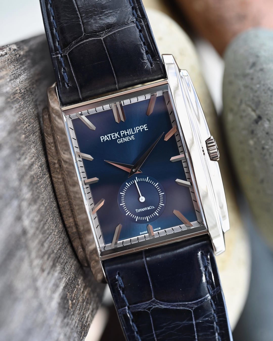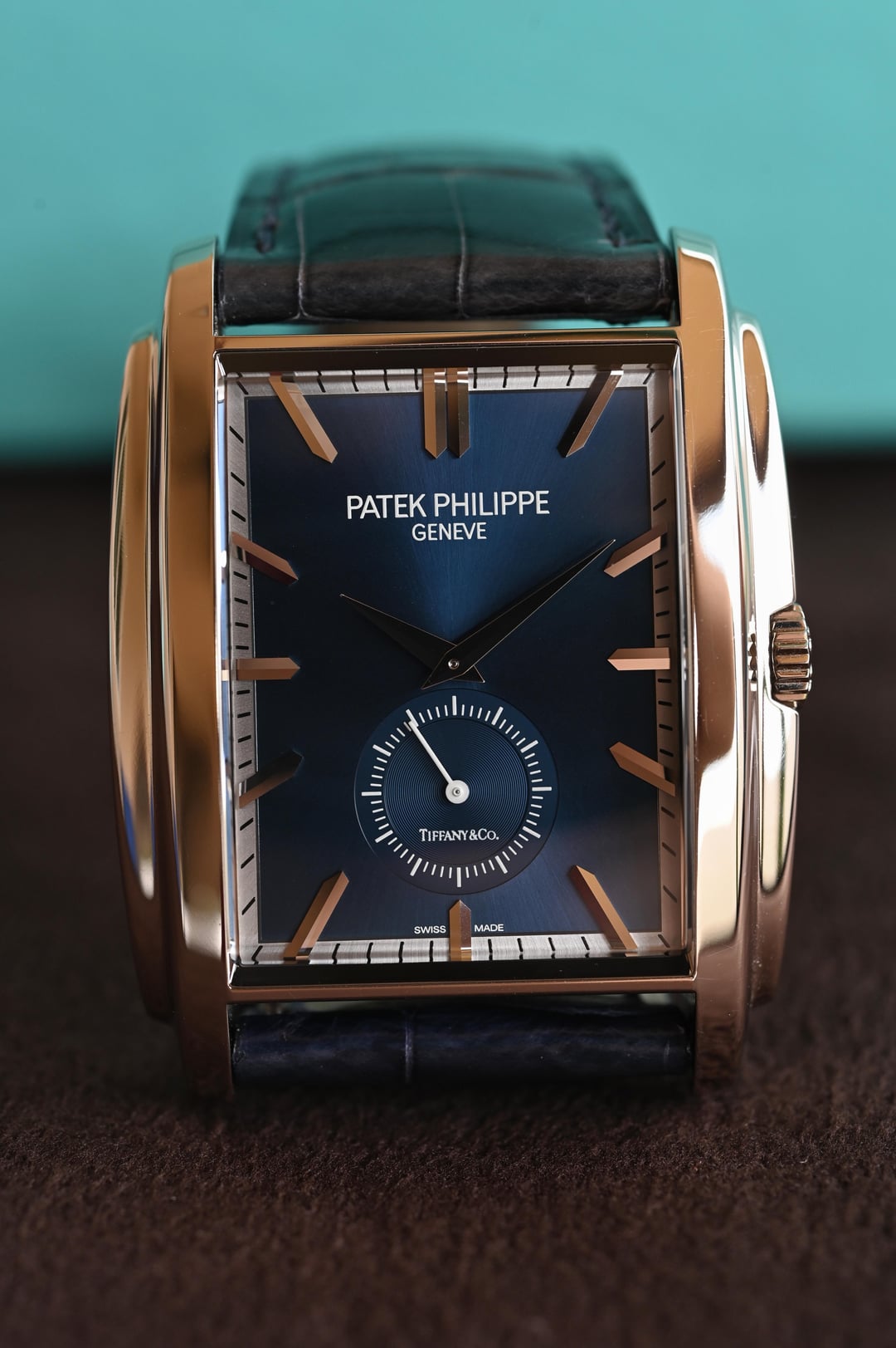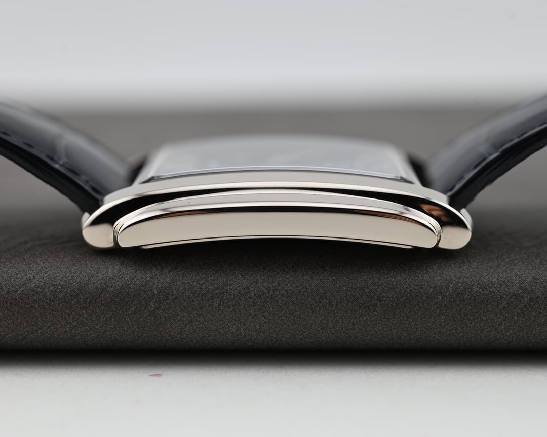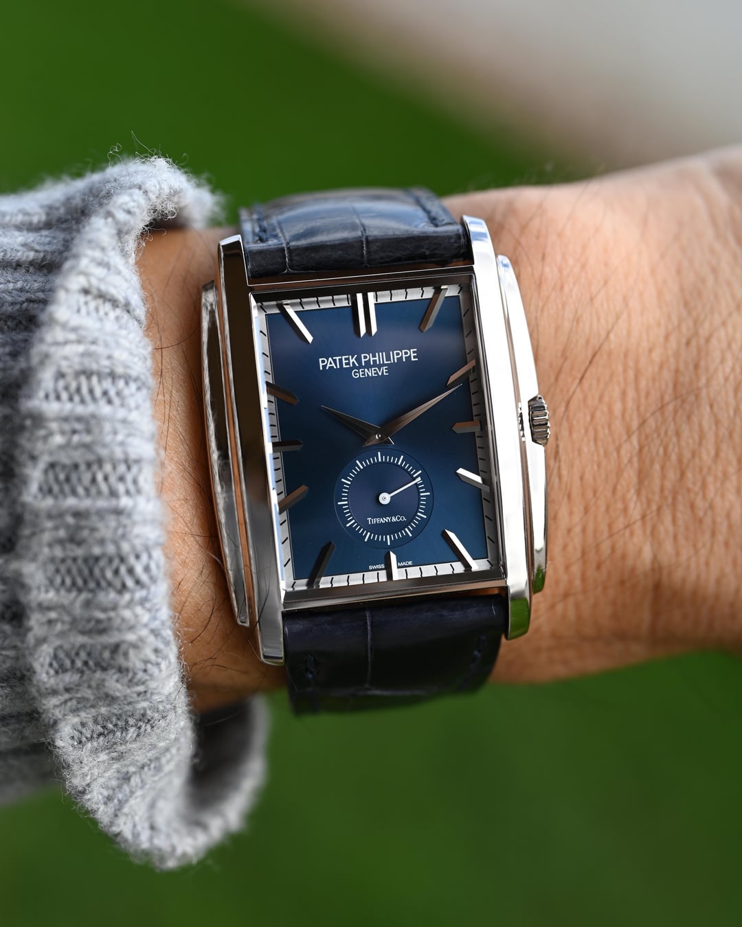 The reference 5124G-011 Gondolo was launched at Baselworld 2015 and here we have a like new, appearing to never have been worn (save for my listing photos), example making for an already special offering of “deadstock”, now ten years on. Then, let’s take it decidedly further with a Tiffany & Co. stamped dial, box, and paperwork, making it possibly the first in this configuration to come to market (please DM if you’ve found another blue Tiffany dial), and you can start to see this is a truly special offering. Taking a more objective look, the 5124 is very interesting; the caliber 25-21 REC PS was the brand’s first non-round caliber since the famous caliber 9-90 and clearly honors the legacy of the storied calibers before it with a classic architecture, layout, and finishing, modernized with the Gryromax balance. The art-deco inspired case wears remarkably well thanks to its curved profile and just 7.5 mm thickness. The dial is certainly no slouch and the finishing and construction feels luxurious at first glance with highly polished and faceted hands and indices laid into the contrasting outer minutes track and the highly dynamic soleil or sunburst blue. The blue dial ranges from a saturated, stoic, rich navy to a bright almost cornflower blue in direct sunlight. The slightly sunken petite seconds dial with concentric circle finishing completes the traditionally high-finished package. If the typical wisdom of something that’s well made but largely overlooked when released often lends to future collectability holds true, then the 5124 is certainly a strong candidate with this specific offering making the most compelling case with the added benefit of the Tiffany signature and full signed set and shop-worn-at-most excellent condition. **Case:** The 33.4 x 42.5 x 7.5 mm solid white gold case is in excellent condition throughout, exhibiting ‘shop’ or ‘display’ wear, at most. The stepped wings flanking the sides of the case ensure it hugs the wrist exceptionally well and doesn’t fall victim to some watches that suffer from being ‘too thin’. The whole case is arched to wear comfortably and beautifully, and make it so much more than just a rectangular watch. **Dial:** The sunburst blue dial is highly versatile and playful with light with a wide range of dynamic blues that really allow the high polished and faceted indices and hands to shine and prominently stand out and further connect the dial to the case design. It is free from any defects and becomes truly special with the inclusion of the Tiffany & Co. signature in the petite seconds dial. **Movement:** The manually wound caliber 25-21 REC PS movement is winding, setting, and running smoothly at approximately -1.8 s/d, averaged across 6 positions. The watch has a classic Patek Calatrava architecture with prominent Cotes de Geneve, anglage, and Patek seal. **Strap:** The watch is presented on its original signed navy alligator strap in standard 75 x 115 mm length with matching white gold pin buckle. **Includes:** A full set complete with Tiffany & Co. outer box, Patek Philippe out box, wooden box with felt cover, leather document folder with museum brochures, manual, and Tiffany & Co. stamped certificate of origin with a March 4, 2022 date of sale. Price: $35,000 USD including fully insured shipping to a FedEx office location or commercial address within the continental US, international shipping available at cost based on location. Payment by ACH or wire, no trades please. I have all positive references here, C24, forums, and Instagram (@)meticulist. Thanks mods for the space.