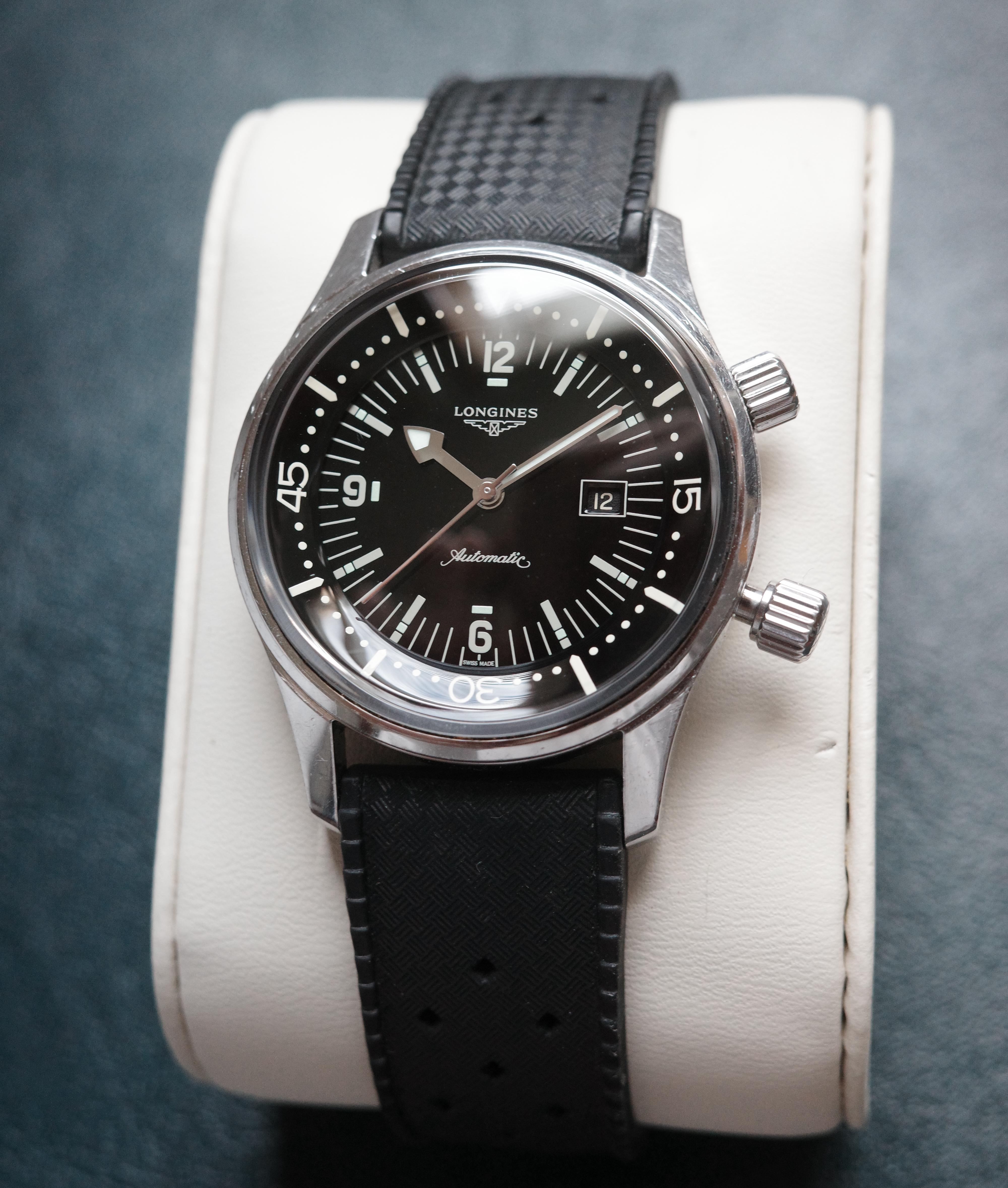 Longines Legend Diver (Discontinued 36mm) Full Box set with original hang tag. This has been a well worn watch, I've owned it for the past 3 years and it's been a daily wear for much of that time. You can see the stories in the case! The Sapphire crystal has held up perfectly. This is a tool watch that can take a beating while holding a little bit of class. Easy to dress up or down. Top crown allows you to set the bezel for timing your eggs, espresso, or your dives. 300m water resistance. Watch keeps great time, has hacking as you can see the crown is pulled out for the photos (video shows crown screwed in) Timestamp, Video, and additional photos here: [https://imgur.com/a/NRJ1Rox](https://imgur.com/a/NRJ1Rox) Note: Original strap is included- the loop by the clasp did break. This can be seen in the the timestamp photo linked above. It now is paired with a Uncle Seiko Waffle Strap. Asking a negotiable $1450 via bank wire, Zelle, or venmo. Price includes fully insured shipping within CONUS. (Shipping is more than normal as Longines loves using a nice, heavy, wooden box)
