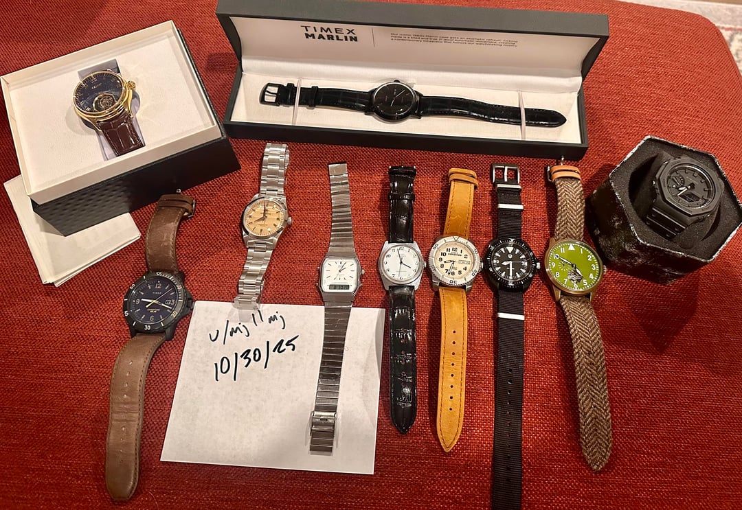 Timestamp and all photos: https://imgur.com/a/qcFrT8O Thinning the collection a bit as my tastes have become more focused over time. I’ve gravitated toward vintage pieces for dressier wear, and my field/daily rotation has settled into a few favorites — so these deserve to go to new homes where they’ll get more wrist time. All watches are in excellent, mint, or new condition as noted. Prices reflect condition and any extras (boxes, straps, etc.). All are running properly and keeping time. ⸻ Shipping & Payment • CONUS only via USPS Priority Mail, carefully packed with new outer boxes and bubble wrap • $10 flat shipping for the first watch, +$5 for each additional (combined shipping available) • Includes $100 USPS insurance; additional insurance available at buyer’s cost upon request • Ships within 2 business days of payment • Payment: PayPal only — buyer pays Goods & Services fee • Buyer agrees to pay within 24 hours of claiming the watch • Reasonable offers welcome, especially for multiple pieces ⸻ Watches for Sale 1. Timex Expedition — $25 No box/papers. Excellent condition, brand-new leather strap. 2. G-Shock GA-2100-1A1 (“CasiOak”) — $80 Full box/papers. Like new. Super cool watch, I just prefer the G-Shock square format. 3. Casio AQ-230 (silver ana-digi) — $25 No box/papers. Very good condition, new battery installed. 4. Timex Marlin (vintage, circa 1980) — $75 No box/papers. Serviced around a year ago but barely worn since, running great. Very good to excellent vintage condition. 5. Watchdives WD1980 — $65 No box/papers. New, unworn. 6. Addiesdive AD2030 — $40 No box/papers. New, unworn. 7. Timex Expedition Gallatin Solar (blue dial) — $60 No box/papers. Excellent condition, solar charging works perfectly. 8. Rugged Maine — Brass Case Open Heart (Seagull ST2501) — $175 No box/papers. Excellent condition. Comes with an extra leather strap, not pictured. 9. Aesop “Starry Skies” Tourbillon (Limited Edition) — $299 Full box/papers. New, unworn. 10. Timex Marlin Jet Automatic (black dial, reissue) — $250 Full box/papers. Mint, barely worn — looks new. Beautiful piece I’m genuinely sad to let go, just not getting worn. All watches ship from the U.S. Feel free to reach out with questions or for additional photos. Thanks for looking!