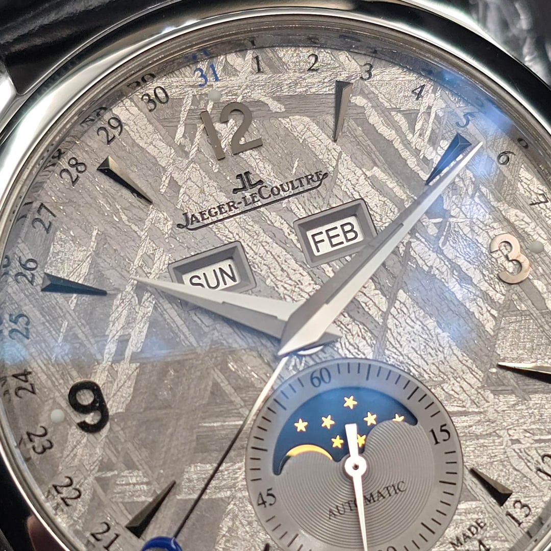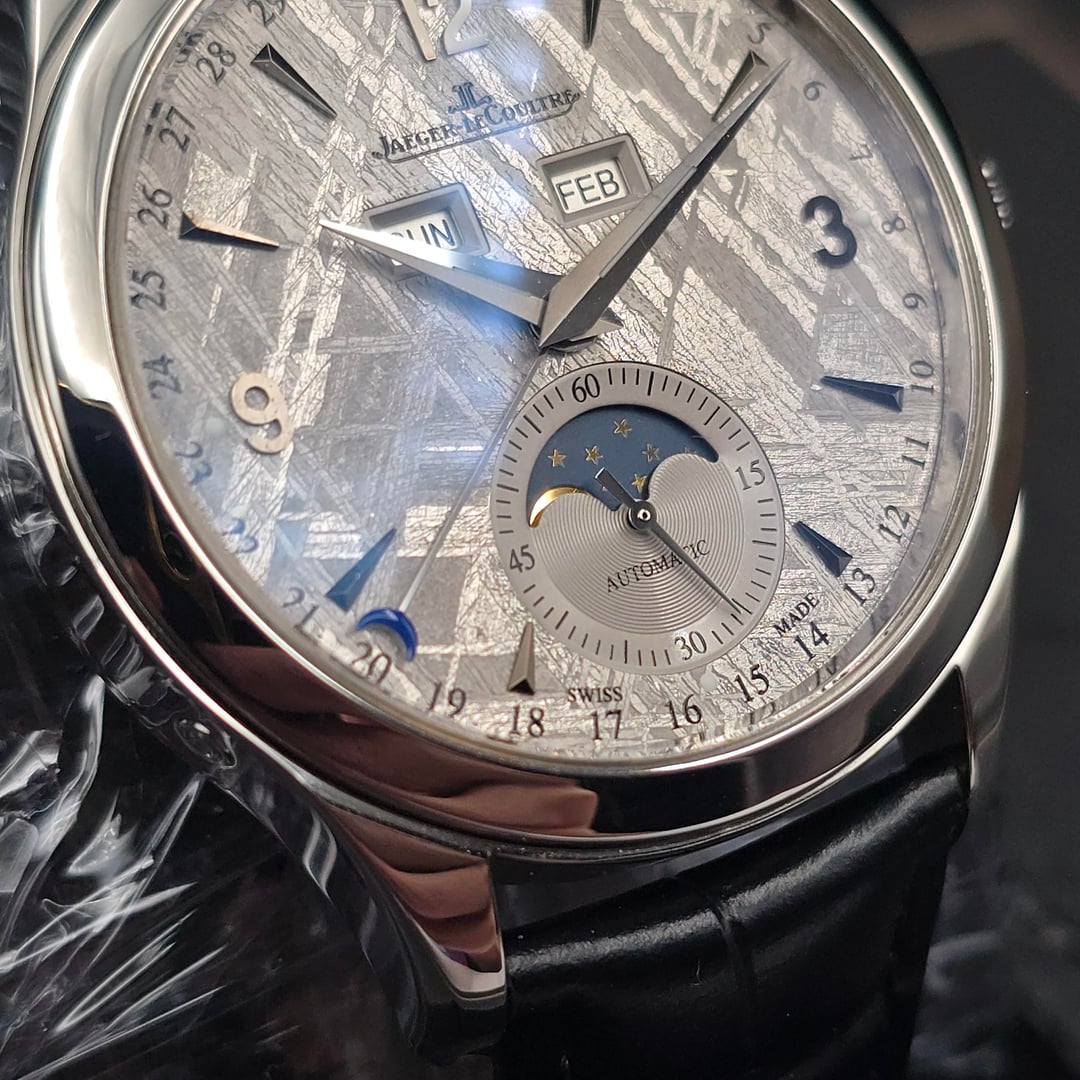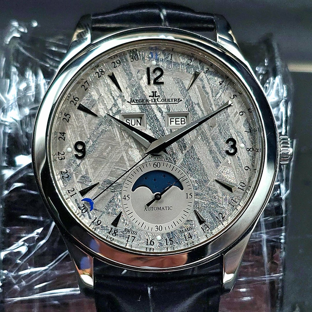 Up for sale here is a hard to come by example of JLC Master Calendar, equipped with the best dial they ever created! Ref. Q1558421. The dial is made from a genuine slice of meteorite, and the Widmanstatten lines looks absolutely incredible as they shift and shine as the light varies. Each one is completely unique, since no piece of any meteorite freezes in the same way as it hurtles through space as a ball of liquid metal!  Cased in stainless steel at 39mm, this watch feels excellent on the wrist. Comes on the JLC leather strap with steel deployant buckle.  Comes as a full set, as delivered from the AD with the warranty papers dated in 2015. The inner liner of the box is deteriorating, and the pillow is wrapped in plastic so the black layer doesn’t rub off onto the watch. Asking price is $9,850. **All watches sold by us come with a 1 year warranty on movement, case, and bracelet functionality.** We have been trading luxury timepieces since 2017 and operate out of the southeast United States. Accepted forms of payment are wire transfer, trades for other watches, or crypto +2%. Turn your digital coins and memes to IRL assets! After payment has been received, we ship out promptly using Fedex Priority Overnight, fully covered by a private insurance company. Packages are sent to a Fedex Office or Ship Center to be held for pickup. Armored carrier or personal delivery will be arranged for pieces valued over $150k. More pictures or video available on request! Plenty of references available, so deal with confidence! We pride ourselves on customer service, communication, and will do what you need to make this a comfortable transaction. Most brands and models of luxury timepiece are accepted on trade. Rolex, Audemars Piguet, Patek Phillipe, Richard Mille, Hublot, Panerai, Zenith, Breitling, Vacheron Constantin, F/P. Journe, A. Lange & Sohne, etc. I can do cash either way or multi-watch trades for the right deal! Check out our other listings on mechanical-art . com