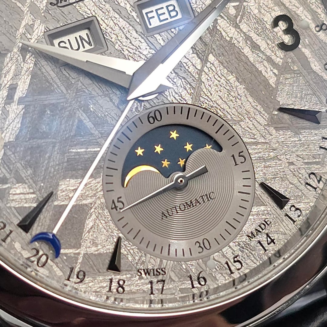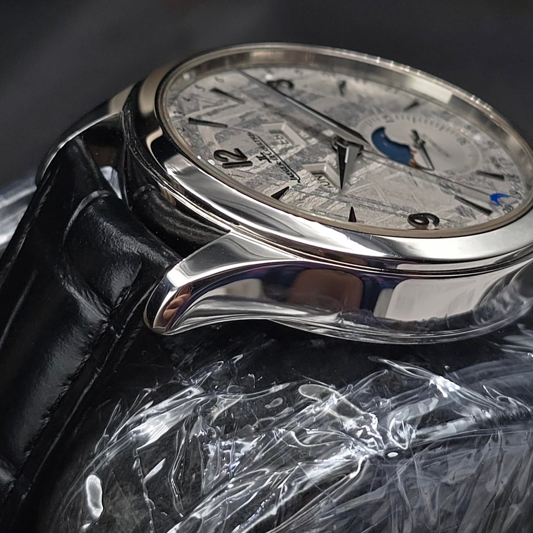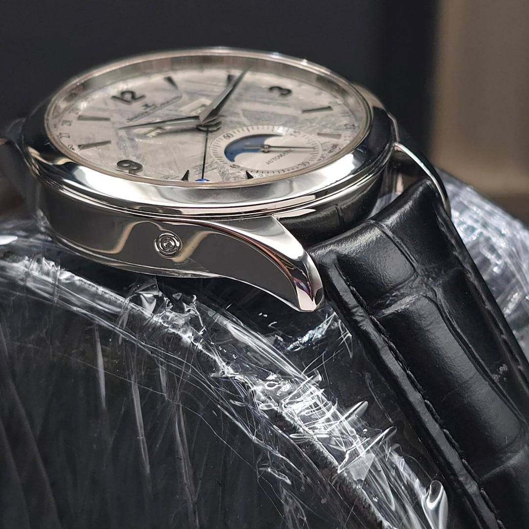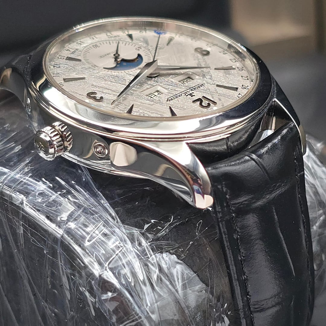 Up for sale here is a hard to come by example of JLC Master Calendar, equipped with the best dial they ever created! Ref. Q1558421. The dial is made from a genuine slice of meteorite, and the Widmanstatten lines looks absolutely incredible as they shift and shine as the light varies. Each one is completely unique, since no piece of any meteorite freezes in the same way as it hurtles through space as a ball of liquid metal!  Cased in stainless steel at 39mm, this watch feels excellent on the wrist. Comes on the JLC leather strap with steel deployant buckle.  Comes as a full set, as delivered from the AD with the warranty papers dated in 2015. The inner liner of the box is deteriorating, and the pillow is wrapped in plastic so the black layer doesn’t rub off onto the watch. Asking price is $9,850. **All watches sold by us come with a 1 year warranty on movement, case, and bracelet functionality.** We have been trading luxury timepieces since 2017 and operate out of the southeast United States. Accepted forms of payment are wire transfer, trades for other watches, or crypto +2%. Turn your digital coins and memes to IRL assets! After payment has been received, we ship out promptly using Fedex Priority Overnight, fully covered by a private insurance company. Packages are sent to a Fedex Office or Ship Center to be held for pickup. Armored carrier or personal delivery will be arranged for pieces valued over $150k. More pictures or video available on request! Plenty of references available, so deal with confidence! We pride ourselves on customer service, communication, and will do what you need to make this a comfortable transaction. Most brands and models of luxury timepiece are accepted on trade. Rolex, Audemars Piguet, Patek Phillipe, Richard Mille, Hublot, Panerai, Zenith, Breitling, Vacheron Constantin, F/P. Journe, A. Lange & Sohne, etc. I can do cash either way or multi-watch trades for the right deal! Check out our other listings on mechanical-art . com