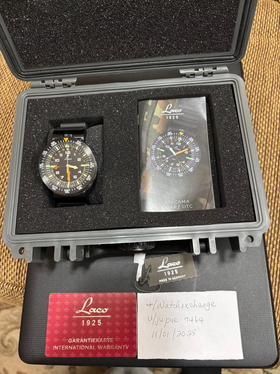 Offering this up for only $375 plus $18 for CONUS shipping via USPS Priority. Watch is in excellent overall cosmetic condition with light wear but nothing excessive or noteworthy imo. No gouges, deep scratches, or dents. Crystal is also clean. Currently on the factory strap and this will come with everything pictured. https://www.laco-watches.com/en/watches/squad-watches/atacama-quarz-utc?srsltid=AfmBOopl5Kdl1CSP21tVWan4R75eAKZ4K2YO_ZmfZXl0H5Cy_RHP_2vc This is being sold as-is with no warranty or returns expressed or implied. Thanks for your consideration and please let me know if you have any additional questions or requests as I'm happy to oblige.